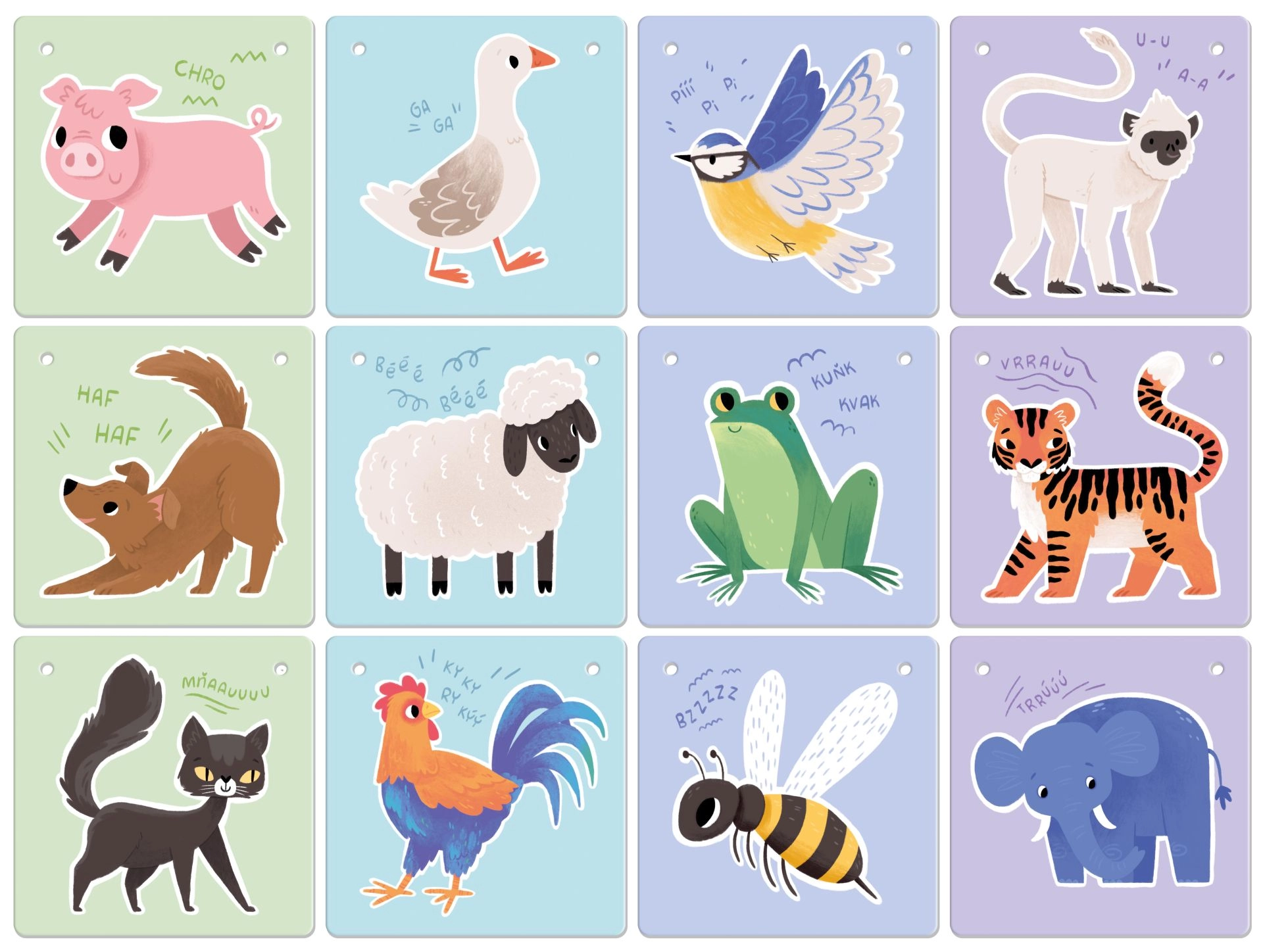 Dieses Set großformatiger Karten wurde für die spielerische Sprachstimulation in der Phase entwickelt, in der Kinder zunächst Laute nachahmen und erst danach Wörter bilden. Klare, gut verständliche Illustrationen mit grafischen Hinweisen motivieren Kinder, Laute wie „miau“, „brumm“ oder „wau“ zu wiederholen und trainieren so ganz natürlich die auditive Unterscheidung, das Gedächtnis und den Rhythmus der Sprache.