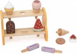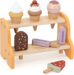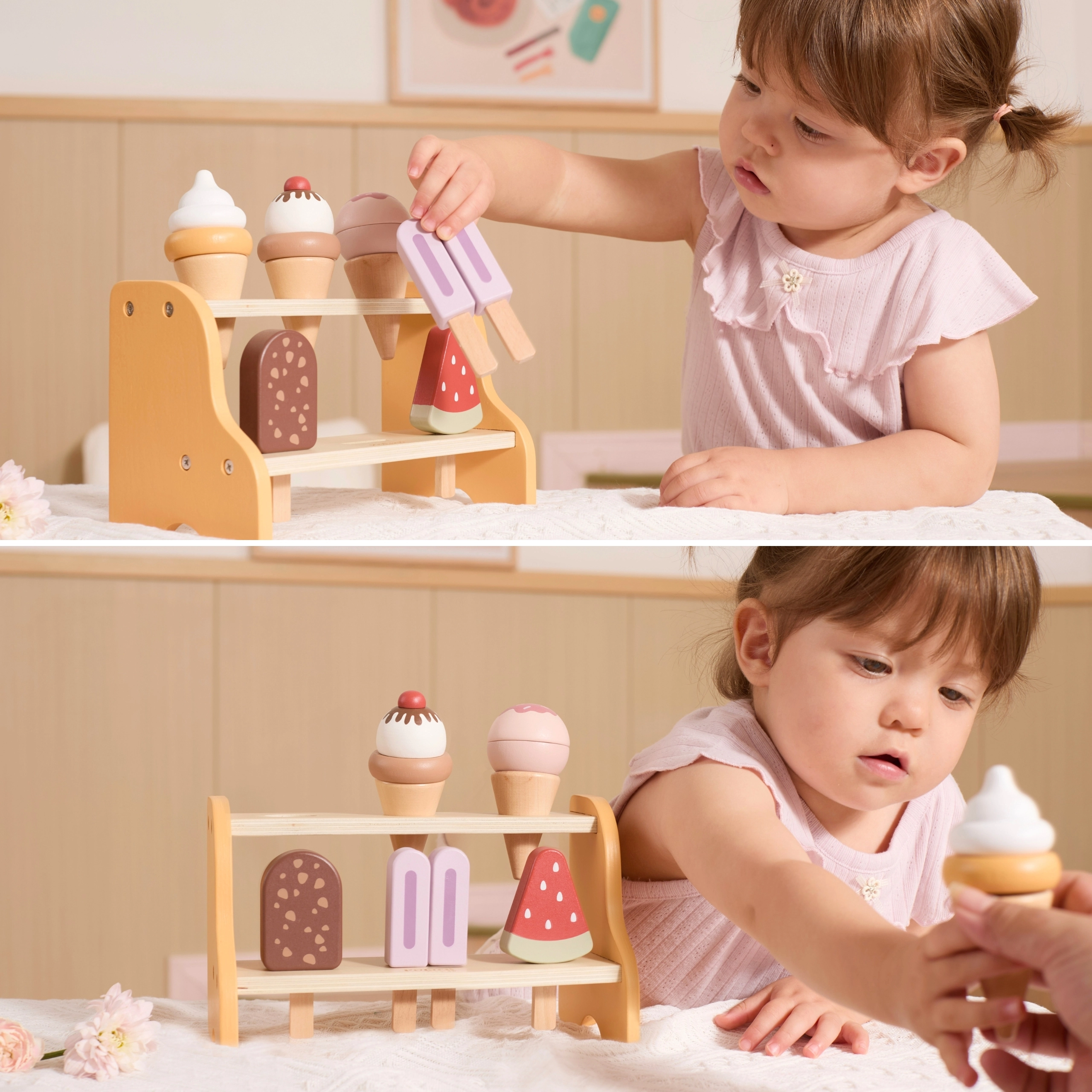Das Holz-Eis-Set von VIGA ist die perfekte Wahl für kleine Verkäuferinnen und Verkäufer. Kinder können Eis auswählen, zusammenstellen und servieren, lernen Farben, Sortieren und entwickeln Fantasie sowie soziale Fähigkeiten beim Spielen mit Freunden. Der robuste, zweistöckige Ständer hält alle Teile übersichtlich an ihrem Platz.