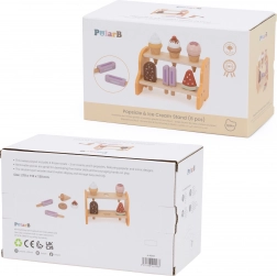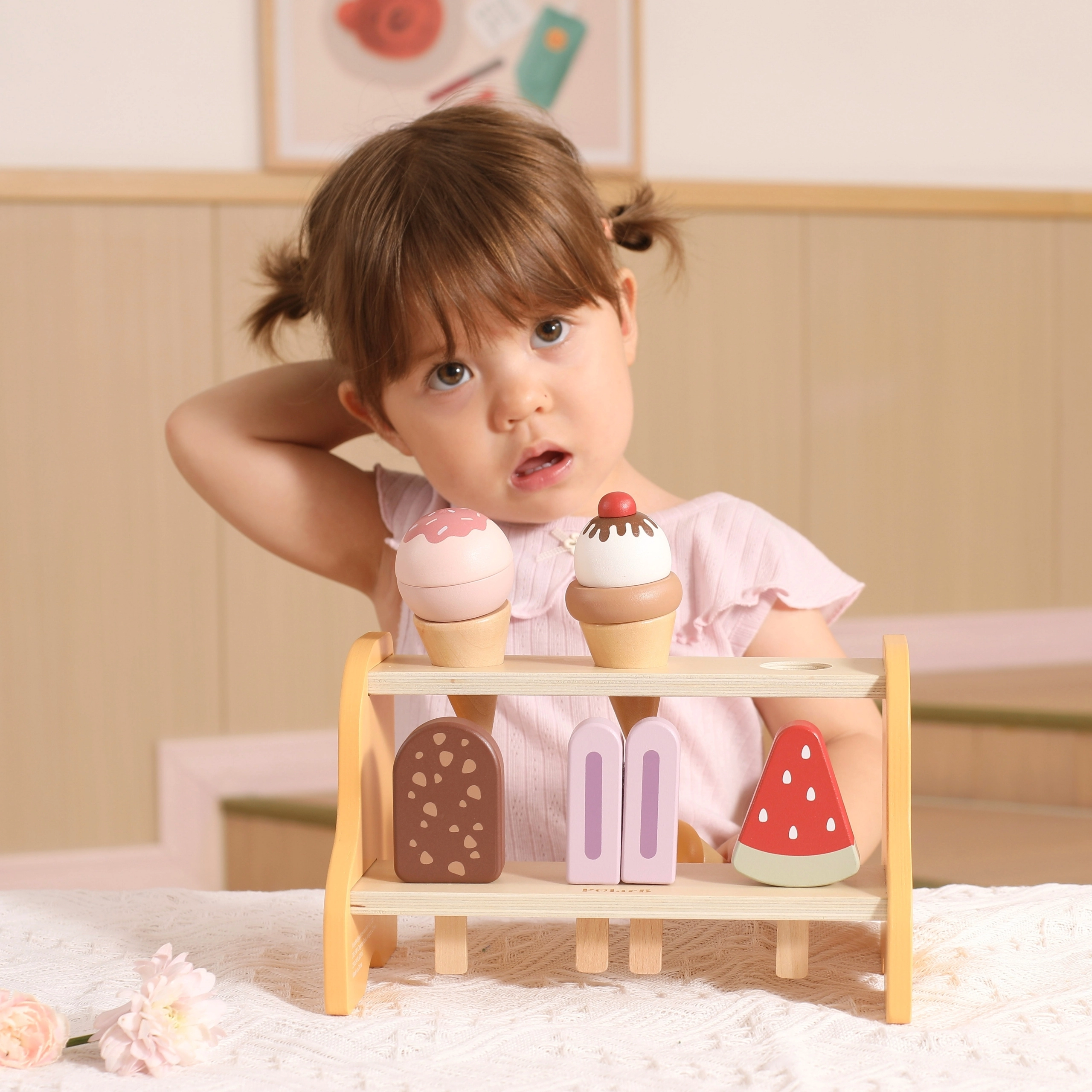 Der stabile Ständer hält alle Waffeln und Eis am Stiel an ihrem Platz, unterstützt Ordnung und visuelle Übersicht beim Kaufladen-Spiel.
