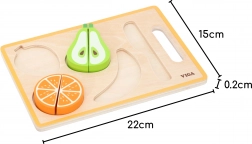 • Lieferumfang: Holzschneidebrett, Holzmesser, 4 Obstsorten: Erdbeere, Birne, Orange, Banane