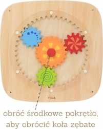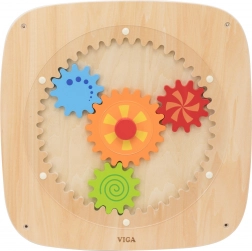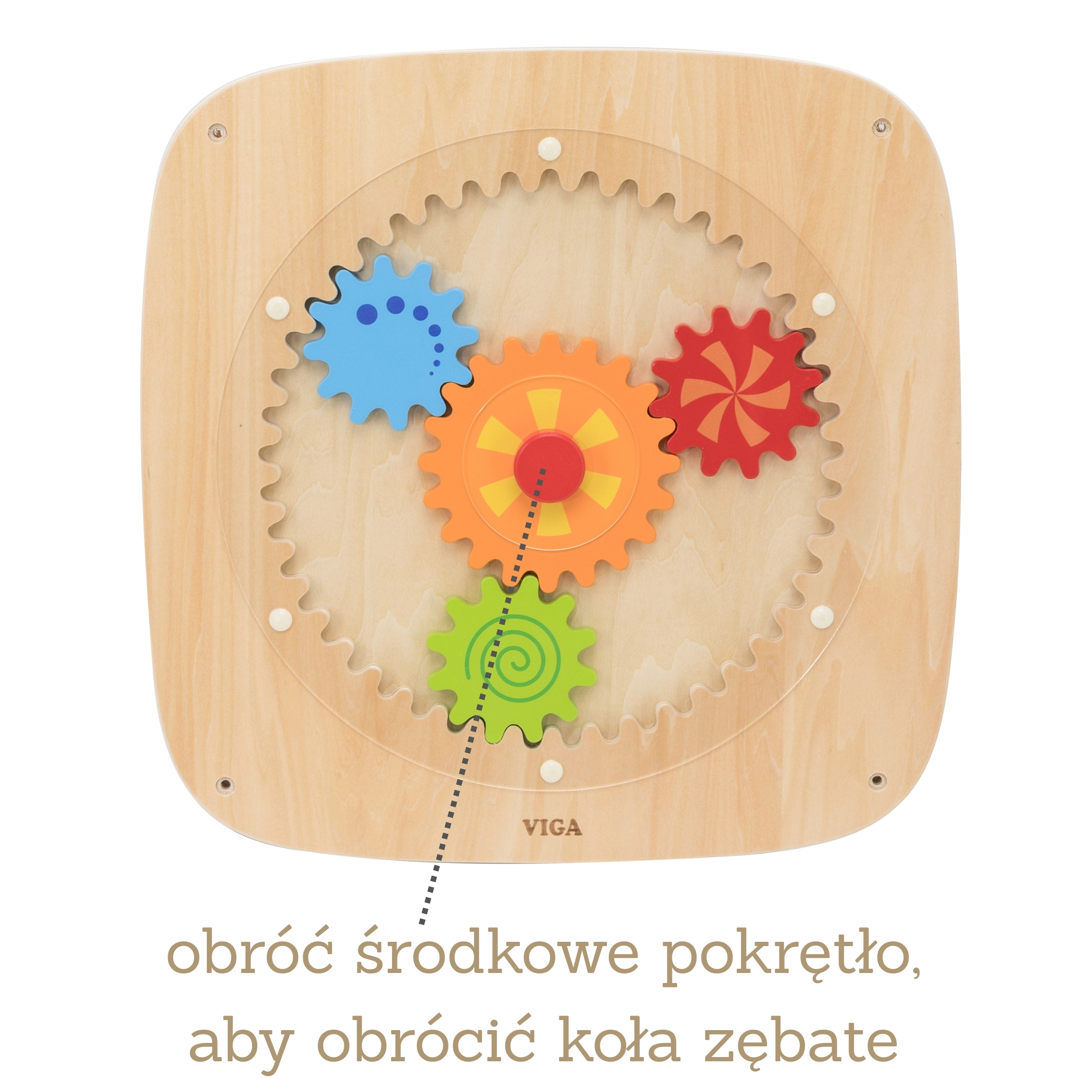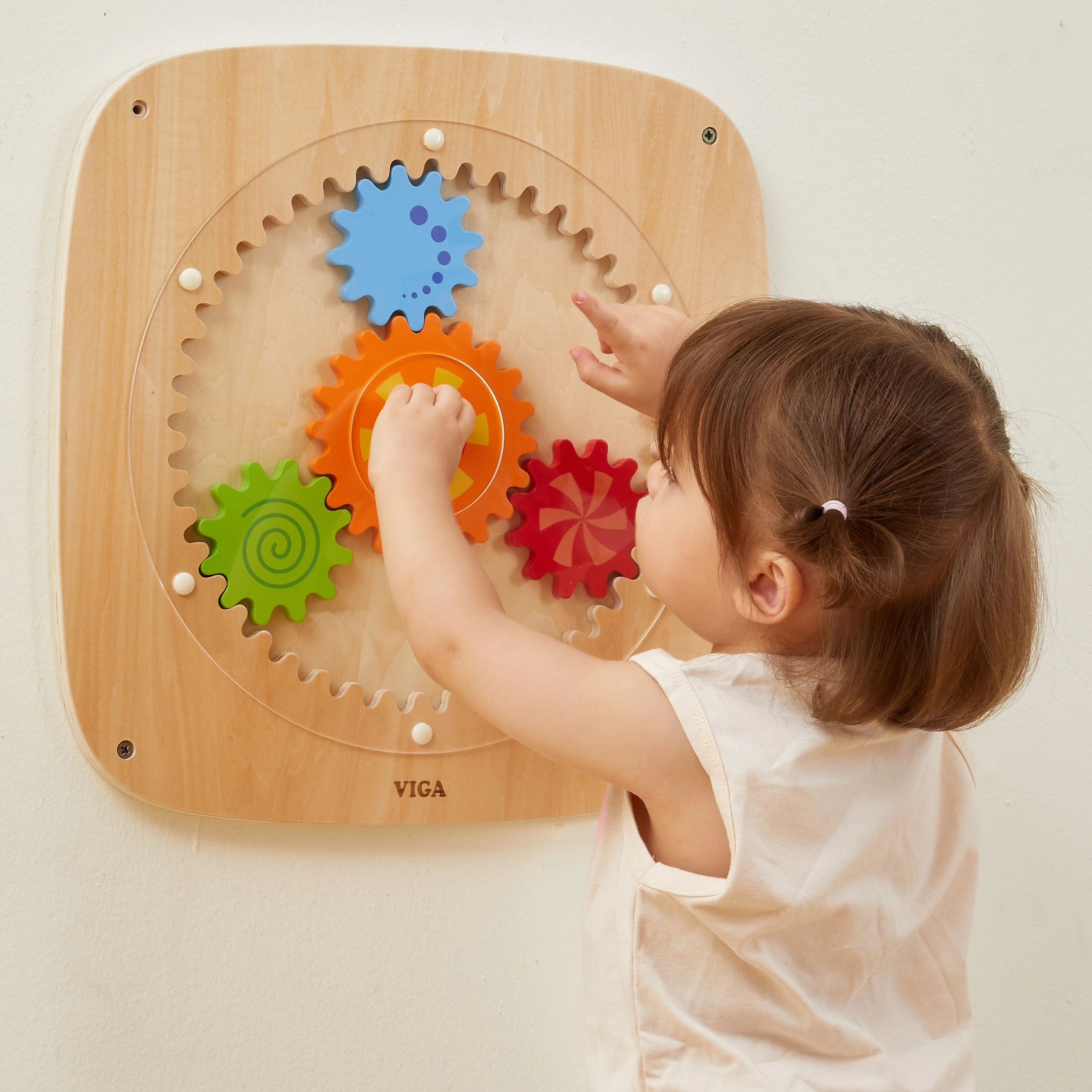 Diese Holz-Wandtafel mit bunten Zahnrädern wurde entwickelt, um Kindern Freude am Entdecken zu bereiten. Durch das Drehen des zentralen Rads setzen sich alle Getriebe gleichzeitig in Bewegung, was Kindern ganz natürlich die Prinzipien von Kraft, Bewegung und Kausalität vermittelt. Unterschiedliche Farben und Muster auf den Rädern erzeugen beim Drehen attraktive visuelle Effekte.