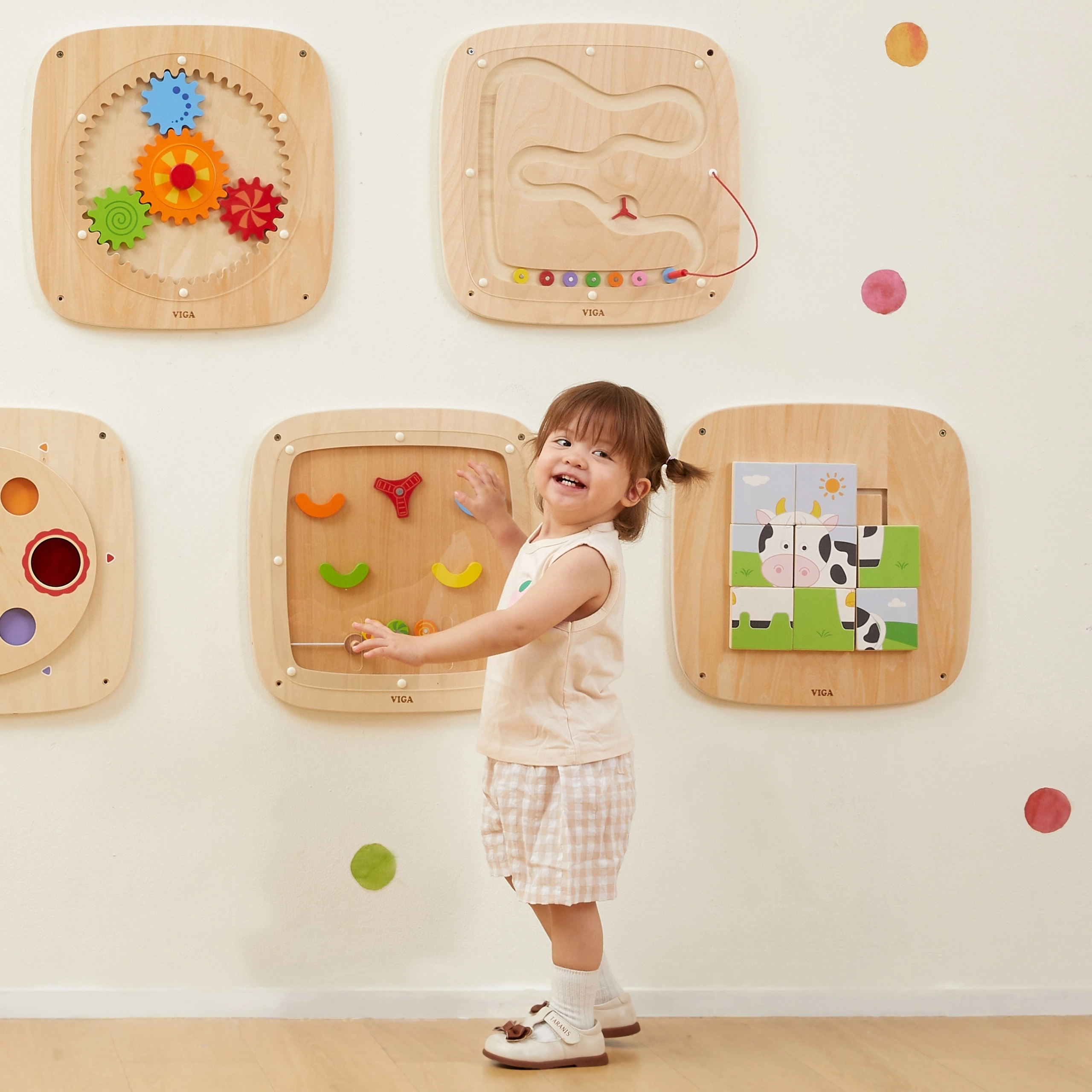 Dank der robusten Holzausführung und abgerundeten Kanten ist das Spielzeug langlebig und sicher für den täglichen Gebrauch. Die Wandmontage spart Platz und unterstützt eine aufgeräumte Umgebung ohne lose Teile auf dem Boden.