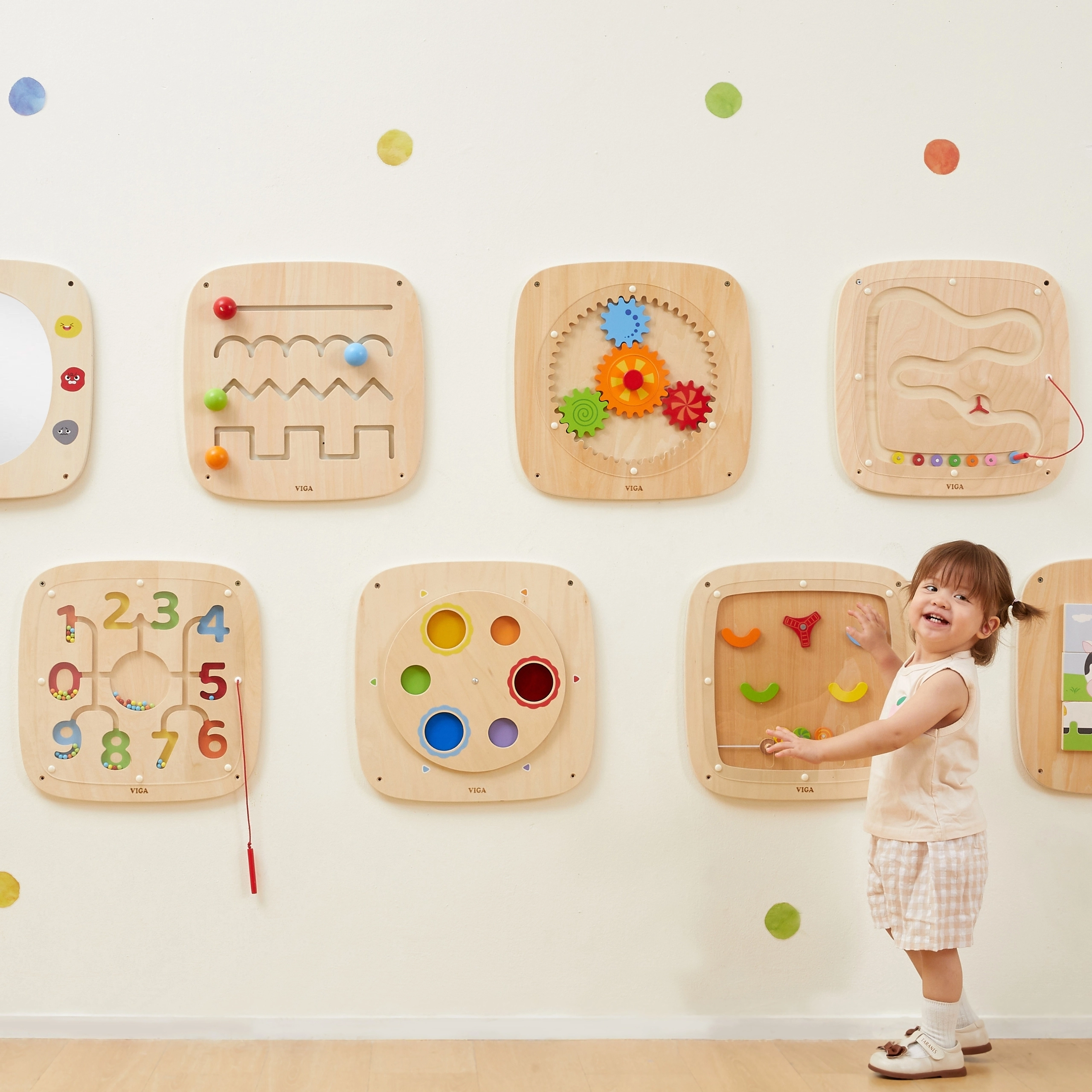 Diese wandmontierte Holztabelle mit den Zahlen 0–9 verbindet Spiel und Lernen in einem. Kinder führen mit dem beiliegenden magnetischen Stylus farbige Kugeln entlang markierter Bahnen, ordnen sie den Zahlen zu und üben so Zählen sowie die Auge-Hand-Koordination.