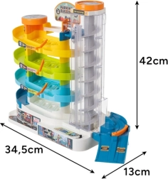 Diese farbenfrohe Parkgarage bringt dynamischen Spielspaß mit Autos – heben Sie sie mit dem manuellen oder elektrischen Aufzug in die oberen Etagen und beobachten Sie, wie sie über die Spiralstrecken rasant nach unten sausen. Dank der fünf Ebenen gibt es reichlich Platz zum Fahren, Parken und Erfinden eigener Verkehrssituationen.
