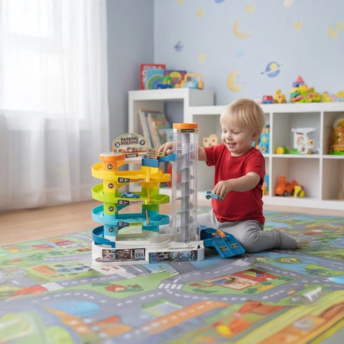 Ein umfangreicher, mehrstöckiger Spielplatz mit flüssigen Abfahrten und Parkzonen fördert Fantasie, Feinmotorik und das Spielen mehrerer Kinder gleichzeitig.