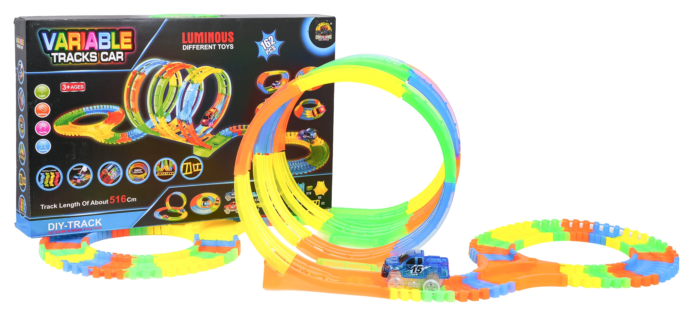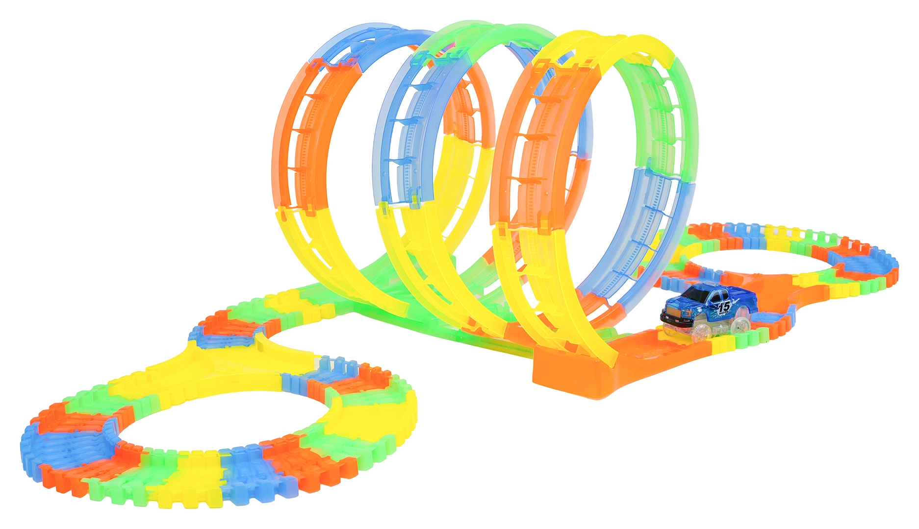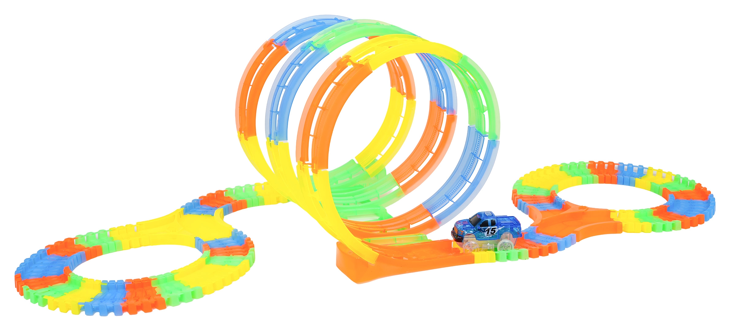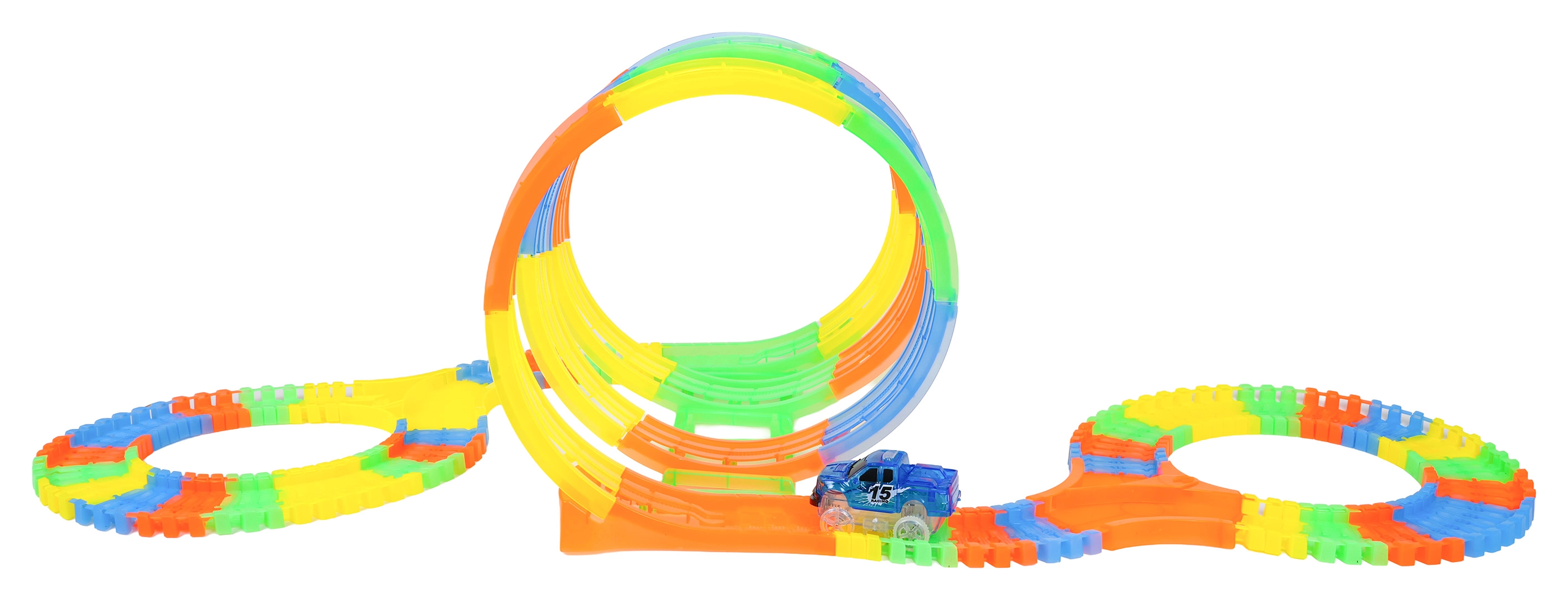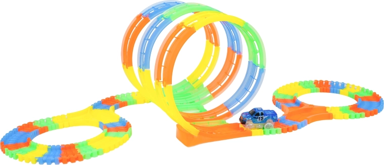 Diese farbenfrohe Rennbahn bietet Kindern kreatives Bauen und dynamische Fahrten. Dank der elastischen, einklickbaren Teile entstehen im Handumdrehen Schleifen, Kurven und Brücken, die jederzeit umgebaut werden können – sogar während der Fahrt. Die fluoreszierende Ausführung der Strecke und die LED-Beleuchtung des Autos zaubern im Dunkeln eine tolle Lichtshow.