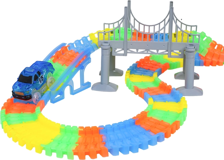 Diese kreative Rennbahn bietet Kindern ab 3 Jahren stundenlangen fantasievollen Spielspaß. Die Teile lassen sich leicht zusammenklicken, die Strecke ist bieg- und drehbar, sodass Sie Brücken, Rampen und wagemutige Kurven gestalten können. Die fluoreszierende Ausführung der Schienen lässt das Zimmer nach dem Ausschalten der Lichter erstrahlen.