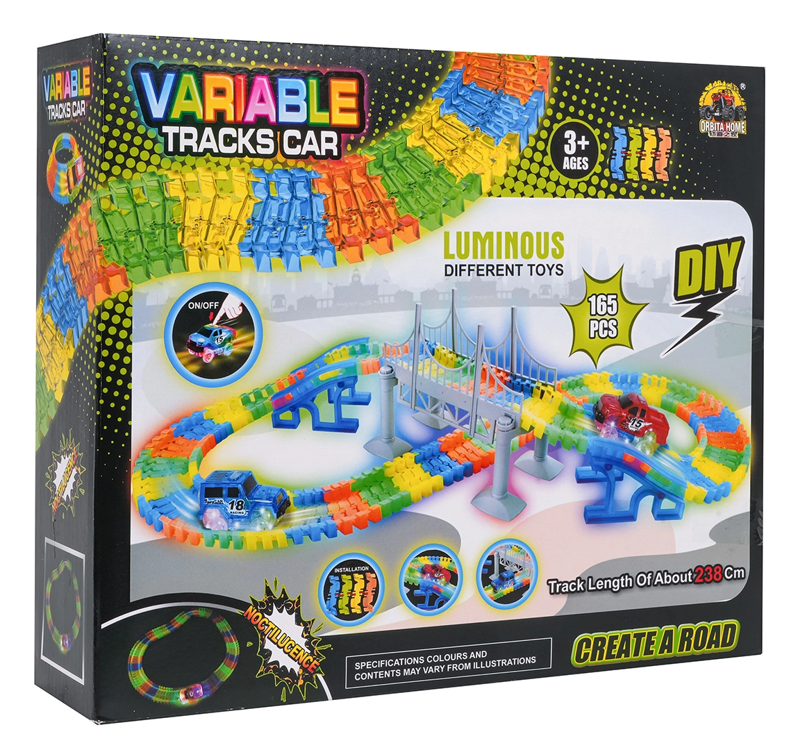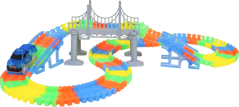 Bauen Sie Ihre eigene Strecke mit dem VARIABLE-Set mit 165 Teilen und flexiblen Schienen, die sich nach Belieben formen lassen. Die Bahn leuchtet im Dunkeln und das beiliegende Auto mit LED-Beleuchtung sorgt für einen beeindruckenden Lichteffekt. Tolle Wahl für Kinder ab 3 Jahren – rascher Spielspaß, kreatives Bauen und endlose Kombinationen.