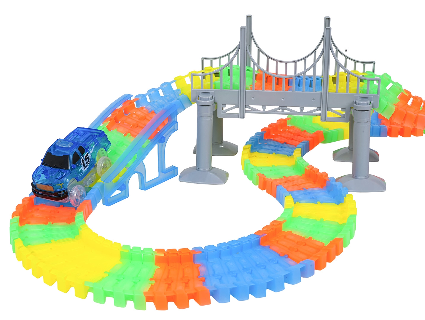 Die Klick-Teile lassen sich leicht biegen, drehen und zu Brücken und Rampen anheben. Kinder gestalten ihren eigenen Kurs ganz nach ihrer Fantasie.