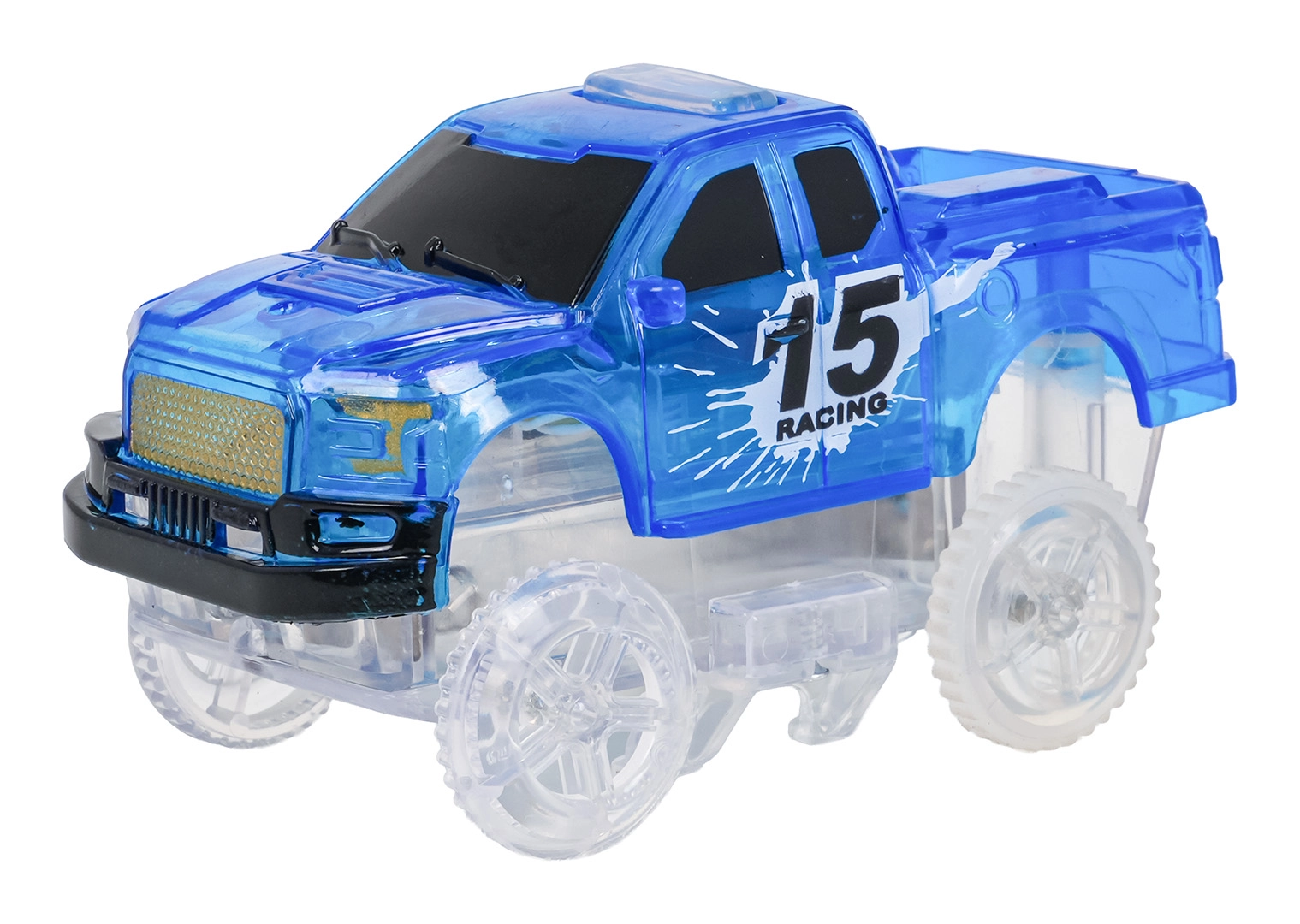 Das transparente Rennauto mit LEDs erweckt die Strecke zum Leben. Einfach die Taste auf dem Dach drücken. Betrieb mit 2× AA (nicht enthalten).