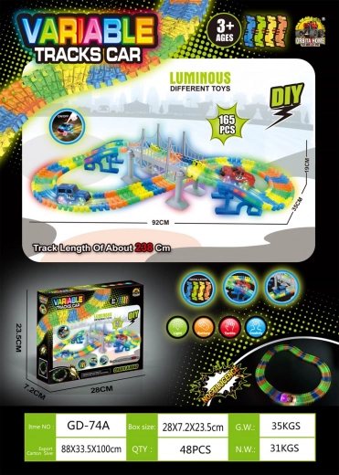 Gestalten Sie Ihre eigene Rennwelt mit der VARIABLE-Rennbahn mit einer Länge von bis zu 238 cm. Die Teile sind flexibel und leicht zu verbinden, sodass Kinder die Strecke schnell verändern und mit neuen Kombinationen experimentieren können. Die fluoreszierende Ausführung sorgt dafür, dass einzelne Teile im Dunkeln leuchten, und die Fahrt des Autos mit LED-Lichtern wird zur echten Lichtshow.