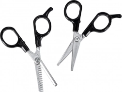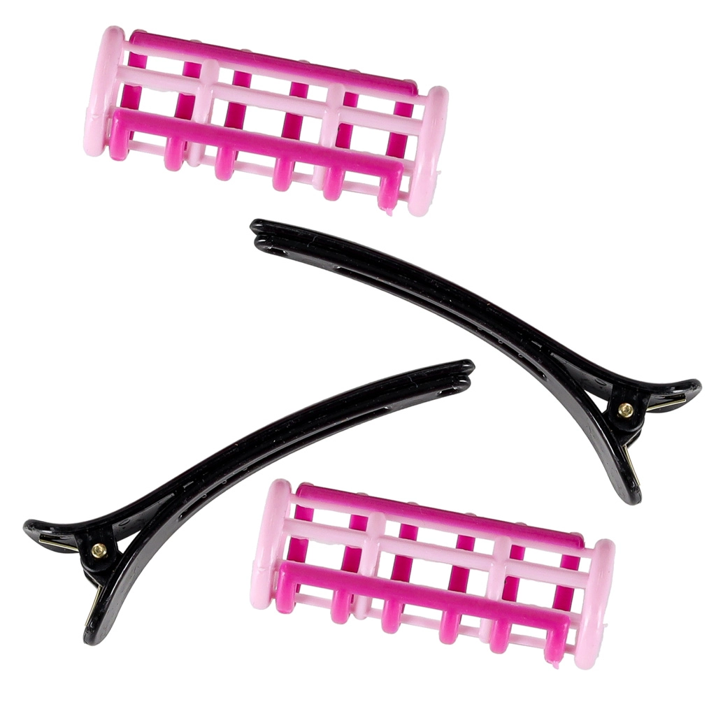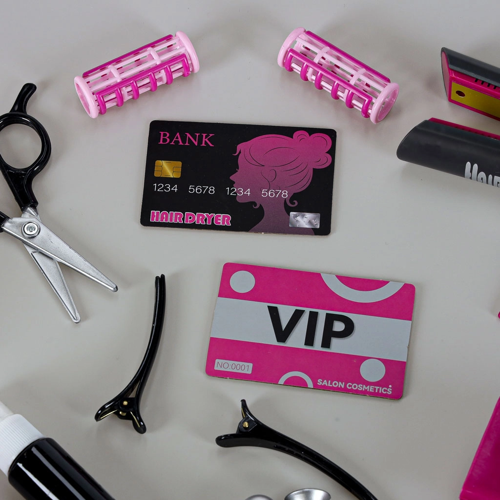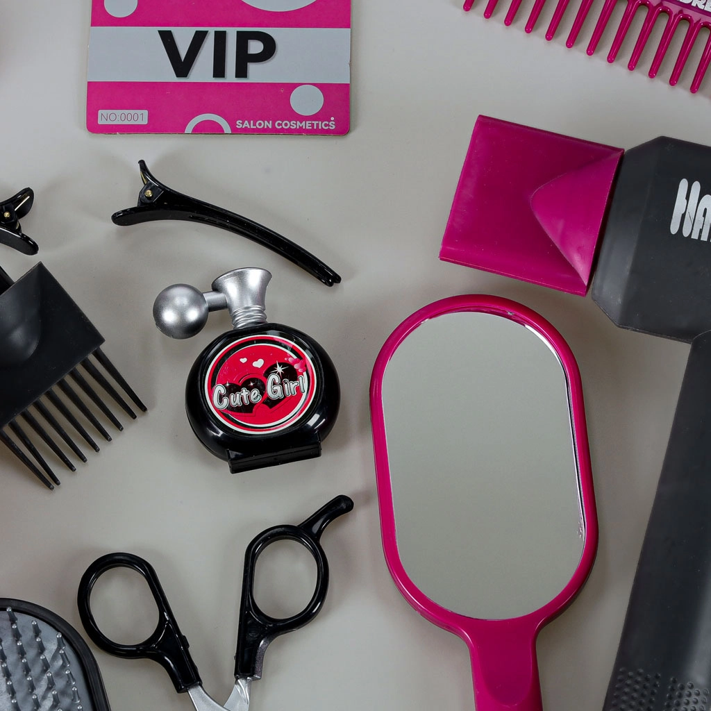 Spiegel, Bürste, Kamm, Sicherheitsschere und Effilierschere, Lockenwickler mit Clips, Fläschchen für „Kosmetik“ sowie Zahlungskarten für das Salon-Rollenspiel.