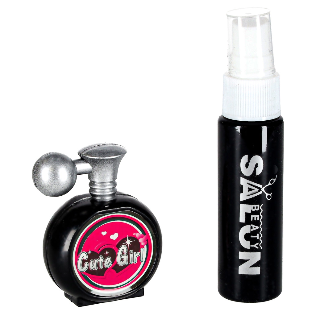 Föhn + 3 Aufsätze (Konzentrator, Diffusor, Kamm), Glätteisen, 2-teiliger Ständer, Spiegel, Bürste, Kamm, Schere und Effilierschere (ohne scharfe Klingen), 2× Lockenwickler, 2× Clip, leeres Fläschchen und „Parfüm“, Zahlungskarte und Stammkundenkarte