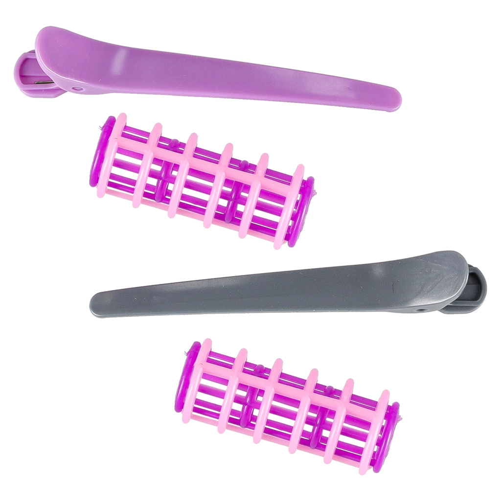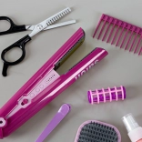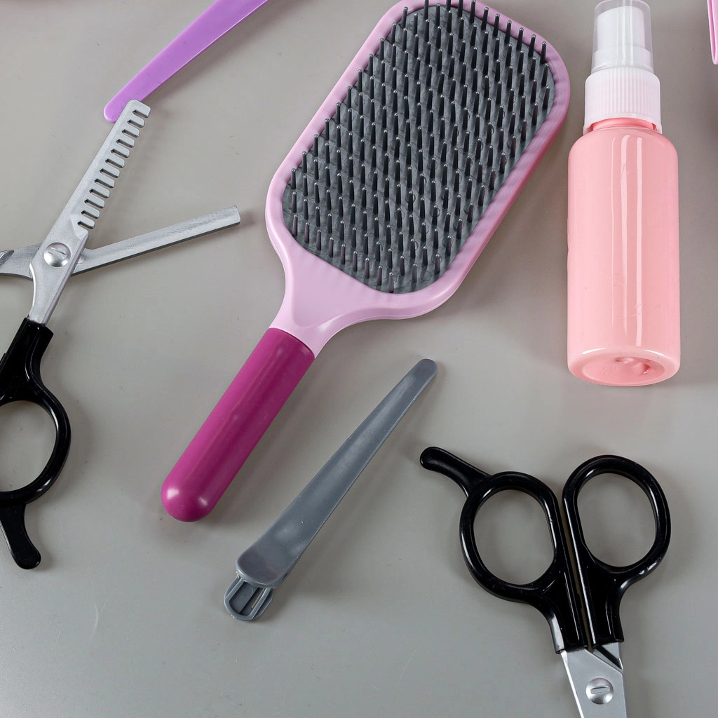 Bürste, Kamm, schneidfreie Scheren, Effilierschere, Lockenwickler, Clips und eine leere Flasche – die komplette Ausstattung für alltägliche Friseurgeschichten.