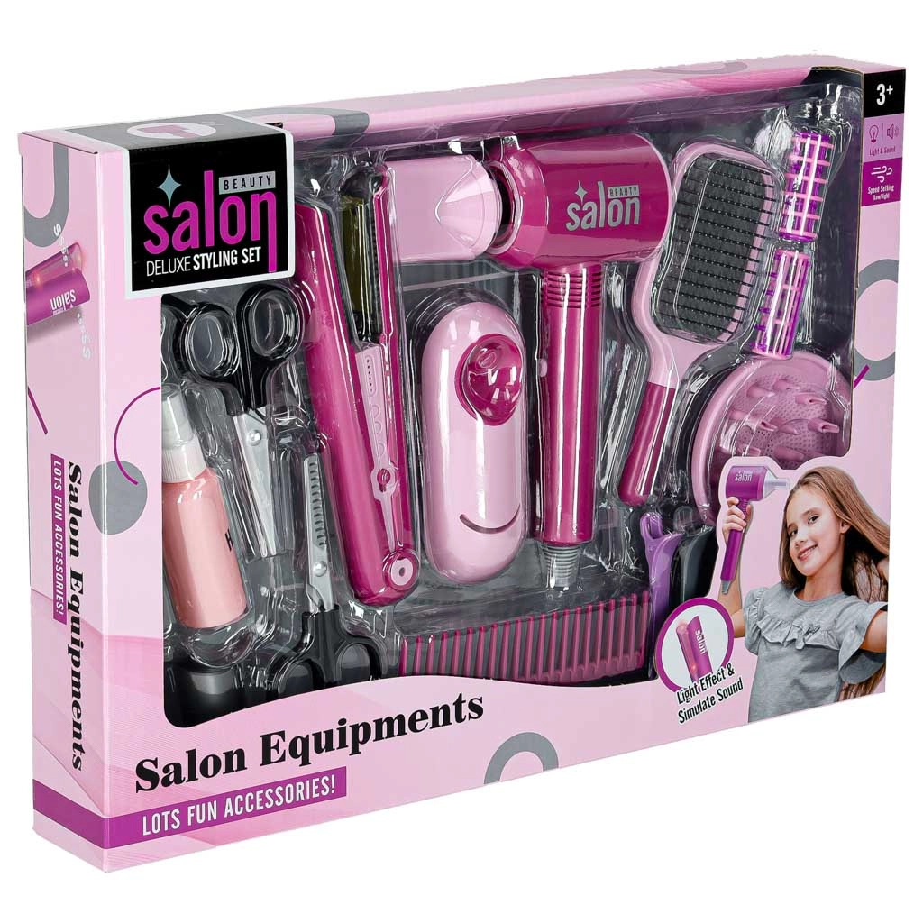 Im Set ist alles für eine komplette Verwandlung enthalten: ein Föhn mit zwei Aufsätzen (Konzentratordüse und Diffusor), ein Kinder-Glätteisen mit Ständer, Bürste und Kamm, 2 Arten schneidfreier Scheren, Lockenwickler und Clips sowie eine leere Flasche für „Styling“. Das gesamte Set ist leicht, robust und sicher für Kinder ab 3 Jahren.