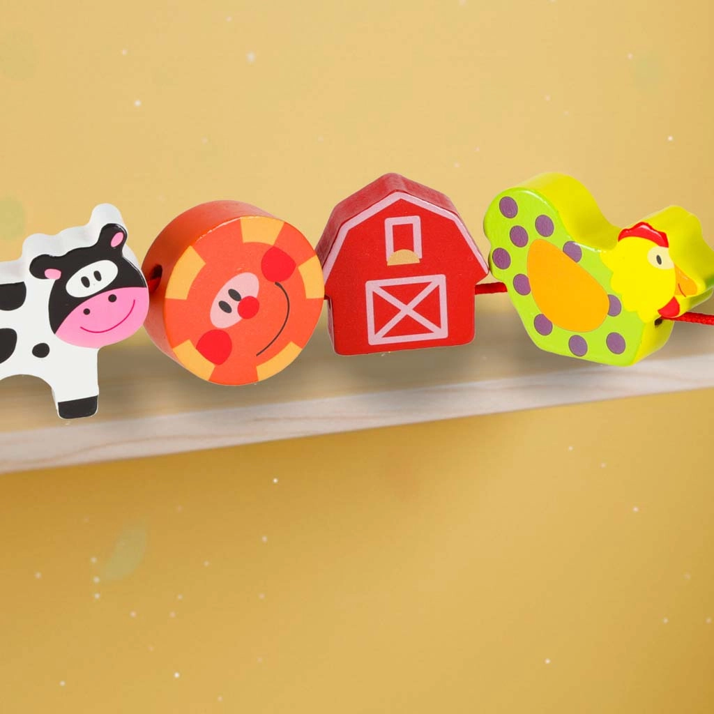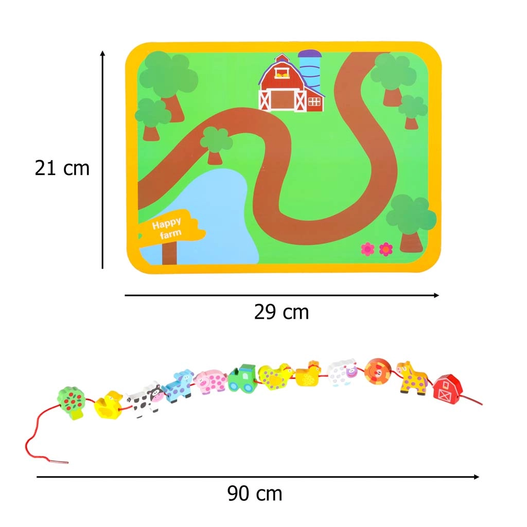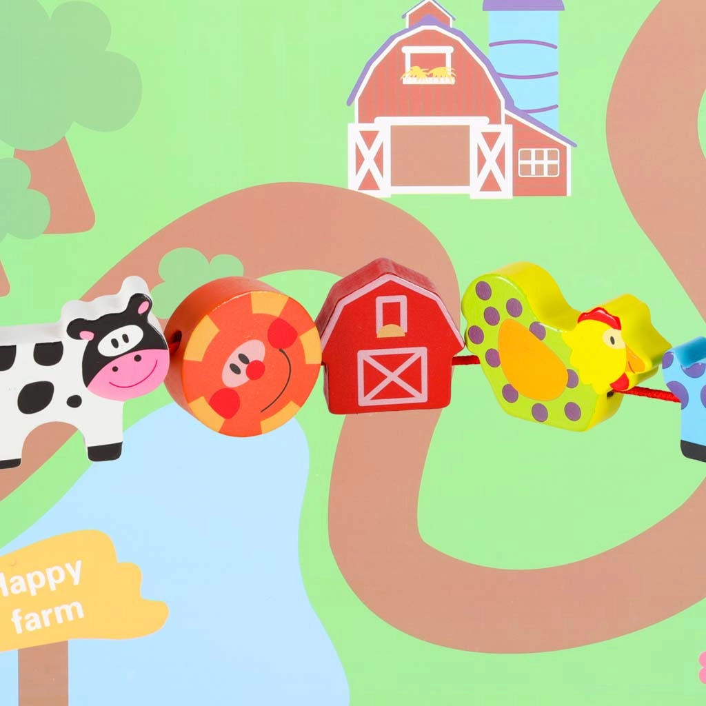 Dieses farbenfrohe Holzset mit Bauernhofmotiven verbindet Spiel und Lernen. Kinder können Tiere, Scheune, Traktor und weitere Teile auf die Schnur auffädeln, Szenen auf der beiliegenden Tafel legen und so Motorik, logisches Denken und Fantasie entwickeln. Glatt verarbeitete, robuste Teile liegen perfekt in kleinen Kinderhänden.