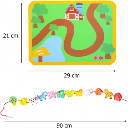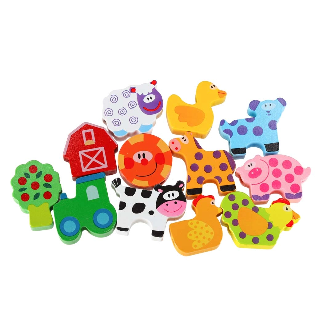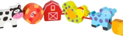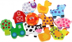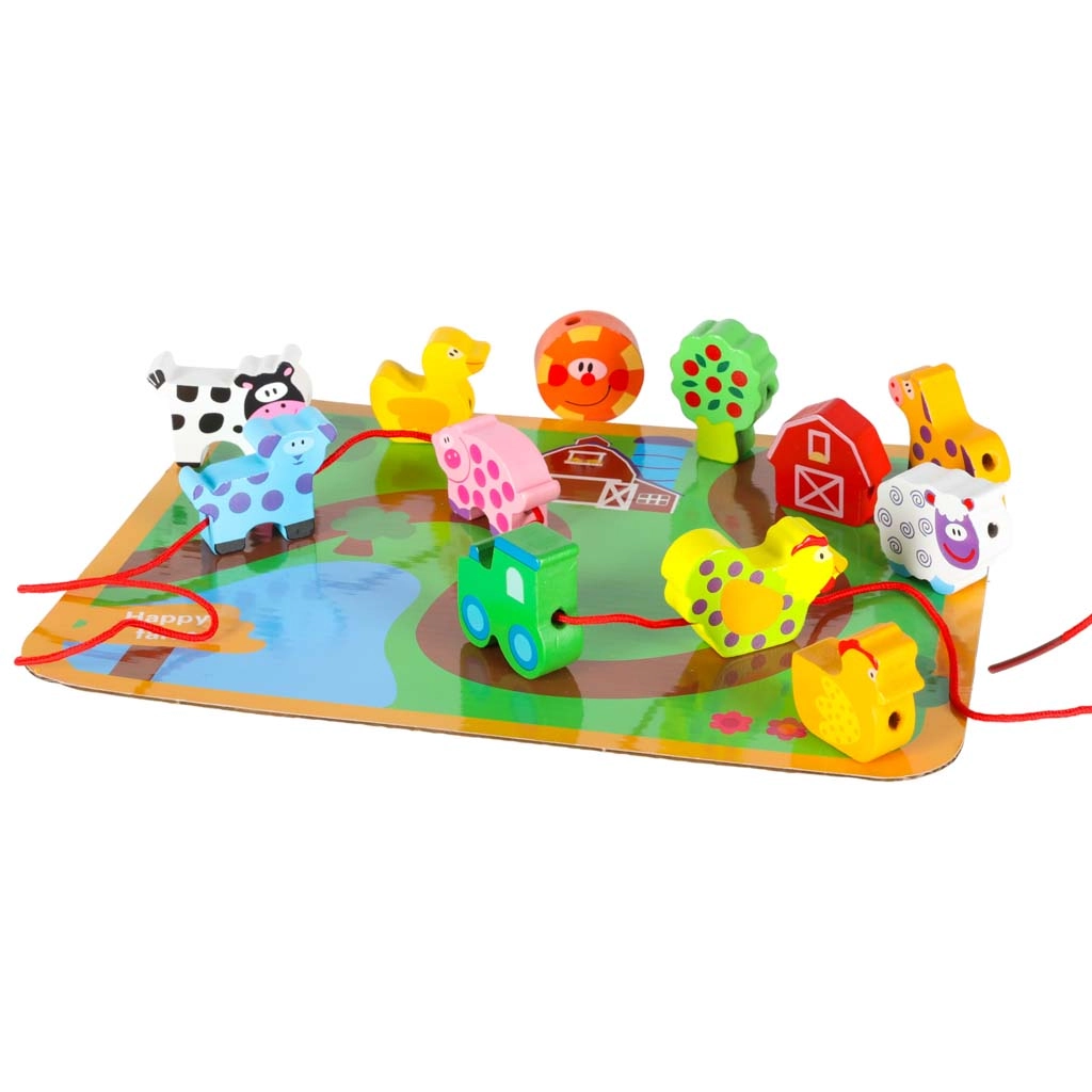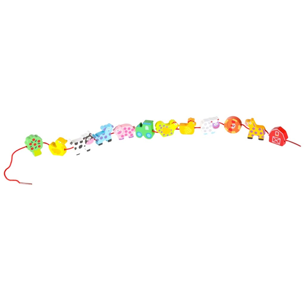 Dieses farbenfrohe Holzset mit Bauernhofmotiven verbindet Spiel und Lernen. Kinder können Tiere, Scheune, Traktor und weitere Teile auf die Schnur auffädeln, Szenen auf der beiliegenden Tafel legen und so Motorik, logisches Denken und Fantasie entwickeln. Glatt verarbeitete, robuste Teile liegen perfekt in kleinen Kinderhänden.