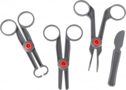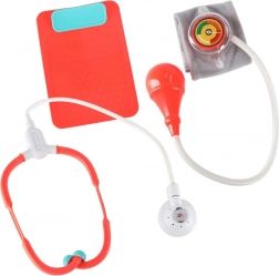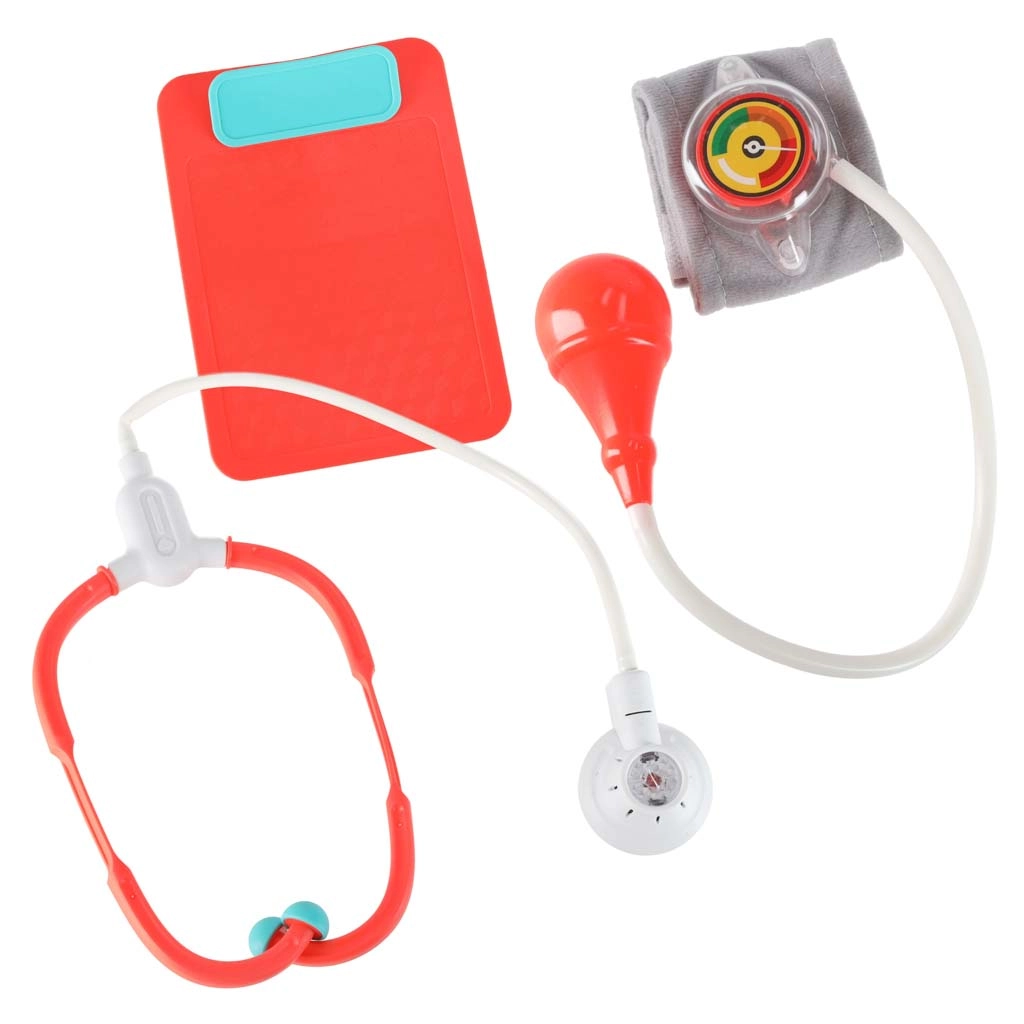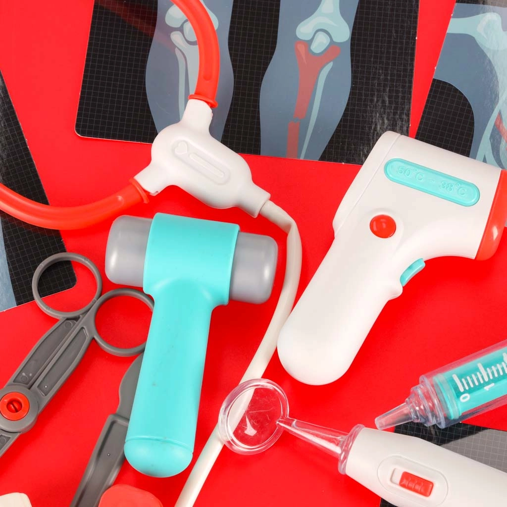Im Set finden Sie alles Nötige für kleine Ärztinnen und Ärzte: Stethoskop (leuchtet und gibt Geräusche von sich), Blutdruckmessgerät, Ultraschall (leuchtet), Taschenlampe (leuchtet), elektronisches Thermometer (leuchtet und gibt Geräusche von sich), Zahnendoskop (leuchtet), Pulsoximeter, neurologischer Reflexhammer, Schere, Zange und Pinzette, Skalpell, Spritze, Medizinbox, Schreibunterlage mit Klemme und 6 Röntgen- und EKG-Aufnahmen.