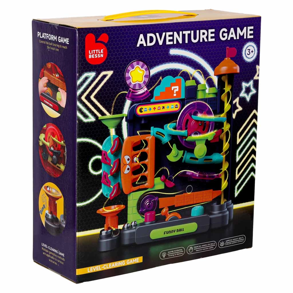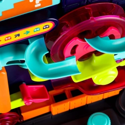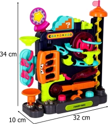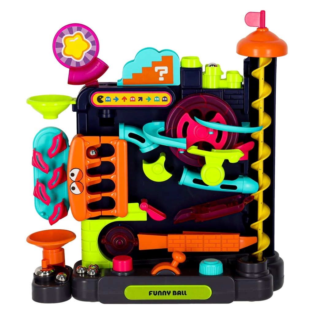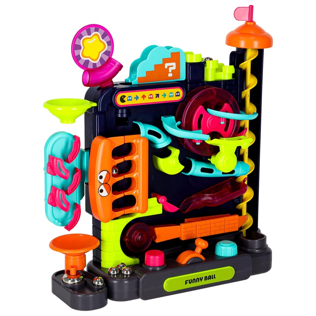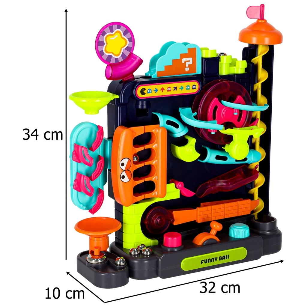 Diese farbenfrohe Kugelbahn bietet Kindern ab 3 Jahren eine spannende Strecke voller Rampen, Spiralen und interaktiver Elemente. Steuern Sie die Bahn mit Hebeln und Drehreglern, beobachten Sie, wie die Kugeln die Hindernisse passieren, und trainieren Sie Koordination sowie Geduld. Ideal für den Spielspaß zu Hause und für einfache Physikexperimente mit der Schwerkraft.