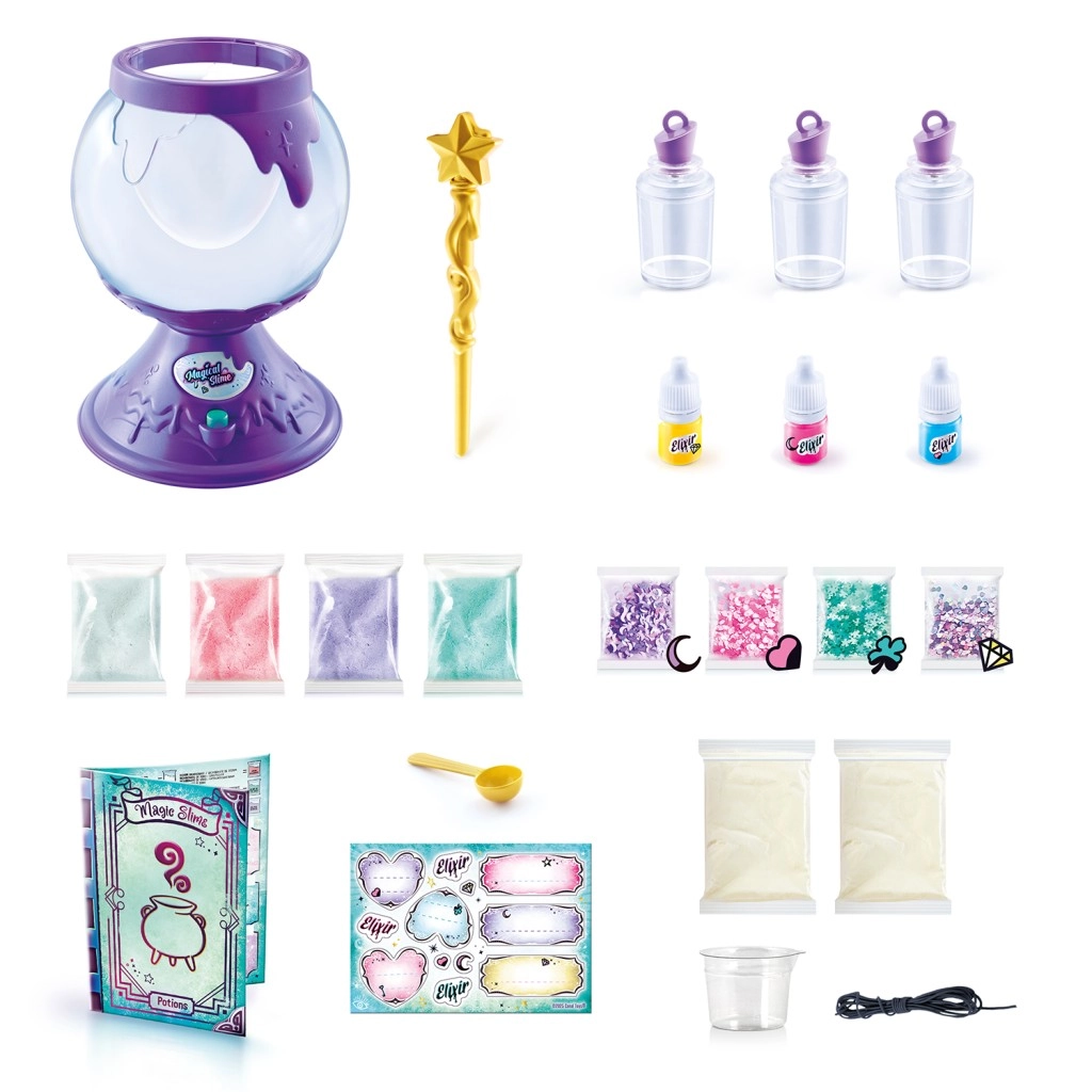 Im Set enthalten sind Schleimpulver, 3 Elixiere, 4 Dekorationen, ein Messbecher, Rezepte und 3 Fläschchen – alles, was Kinder für ihre eigenen magischen Mischungen brauchen.
