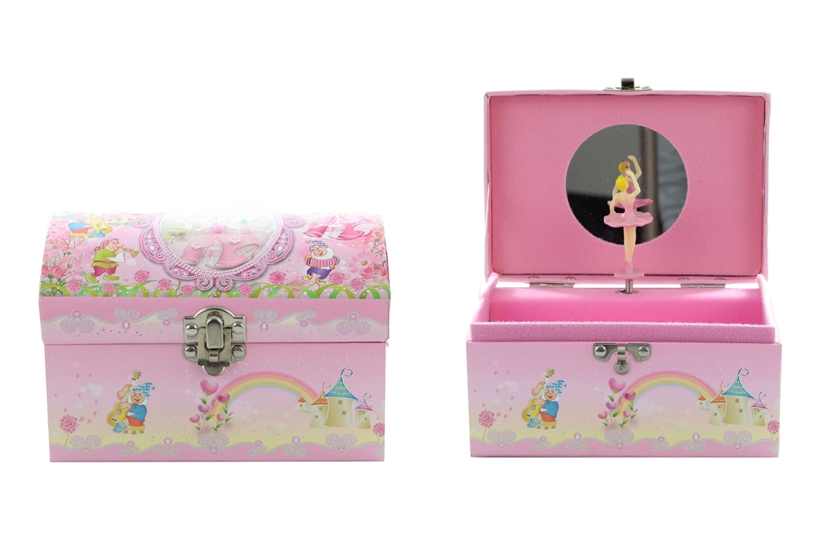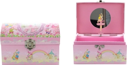 Elegantes Musik-Schmuckkästchen in Truhenform für die stilvolle Aufbewahrung von Schmuck. Nach dem Aufziehen des Schlüssels dreht sich im Inneren eine Ballerina und eine Melodie erklingt. Innen finden Sie einen praktischen Spiegel und Platz für Kleinigkeiten. Romantisches Design, tanzende Ballerina und Musikmechanismus erfreuen jede Liebhaberin schöner Accessoires.