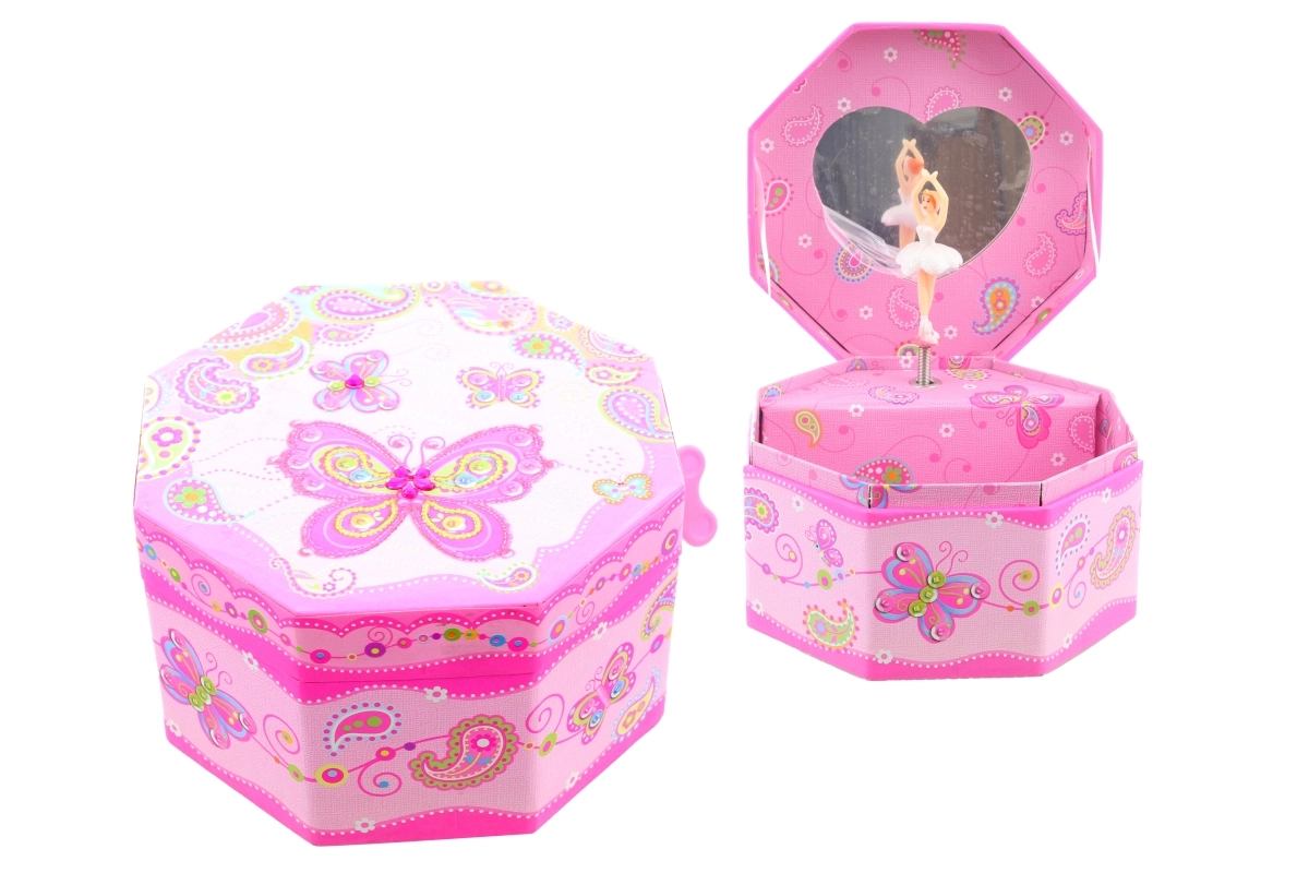 Elegantes Spieluhr-Schmuckkästchen in Truhenform mit Schmetterlingsmotiv, das jeden Liebhaber schöner Accessoires begeistert. Nach dem Aufziehen des Schlüssels dreht sich im Inneren eine Ballerina und eine sanfte Melodie erklingt. Innen befindet sich ein praktischer Spiegel für das einfache Ablegen von Schmuck und kleinen Dingen. Ideal als Dekoration oder originelles Geschenk. Romantisches Design, tanzende Ballerina, Melodie nach dem Aufziehen, Spiegel im Inneren.