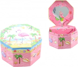 Dieses bezaubernde Musik-Schmuckkästchen in Rosa zeichnet sich durch eine achteckige Form und ein tropisches Motiv mit Flamingo, Palmen und Muscheln aus. Beim Öffnen erscheint ein tanzender Flamingo vor einem Herzspiegel, der sich nach dem Aufziehen des Schlüssels dreht und das Verstauen von Schmuck mit einer angenehmen Melodie begleitet.