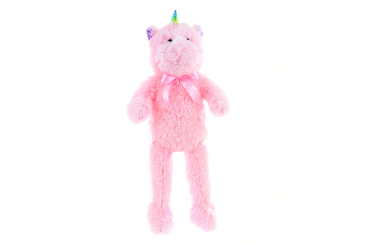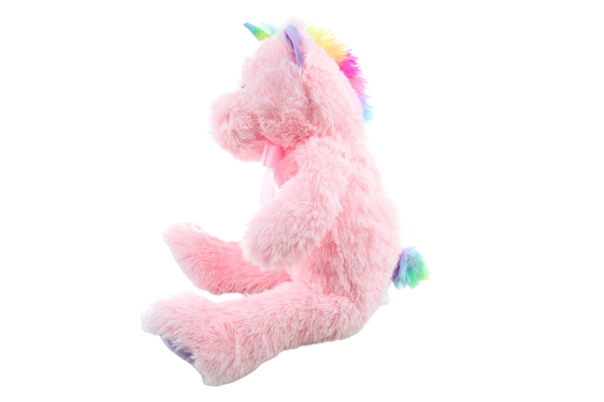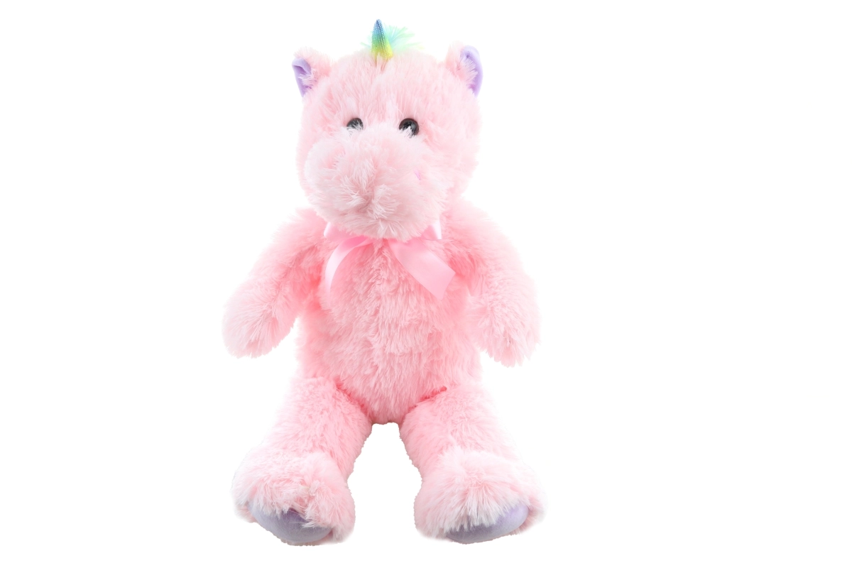 Farbiges Horn, Mähne und ein Satinschleifchen verleihen dem Spielzeug einen zauberhaften Look, den Kinder lieben.