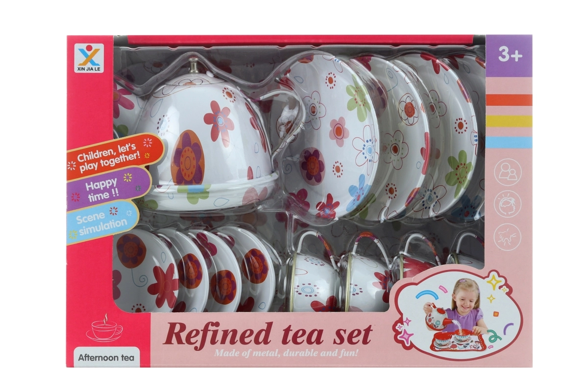 Das Set enthält eine Kanne, Teller, Untertassen und Tassen, sodass Kinder „Tee“ für sich und ihre Freunde servieren können. Alles ist in einer praktischen Box verstaut, die das Tragen und Aufbewahren erleichtert.