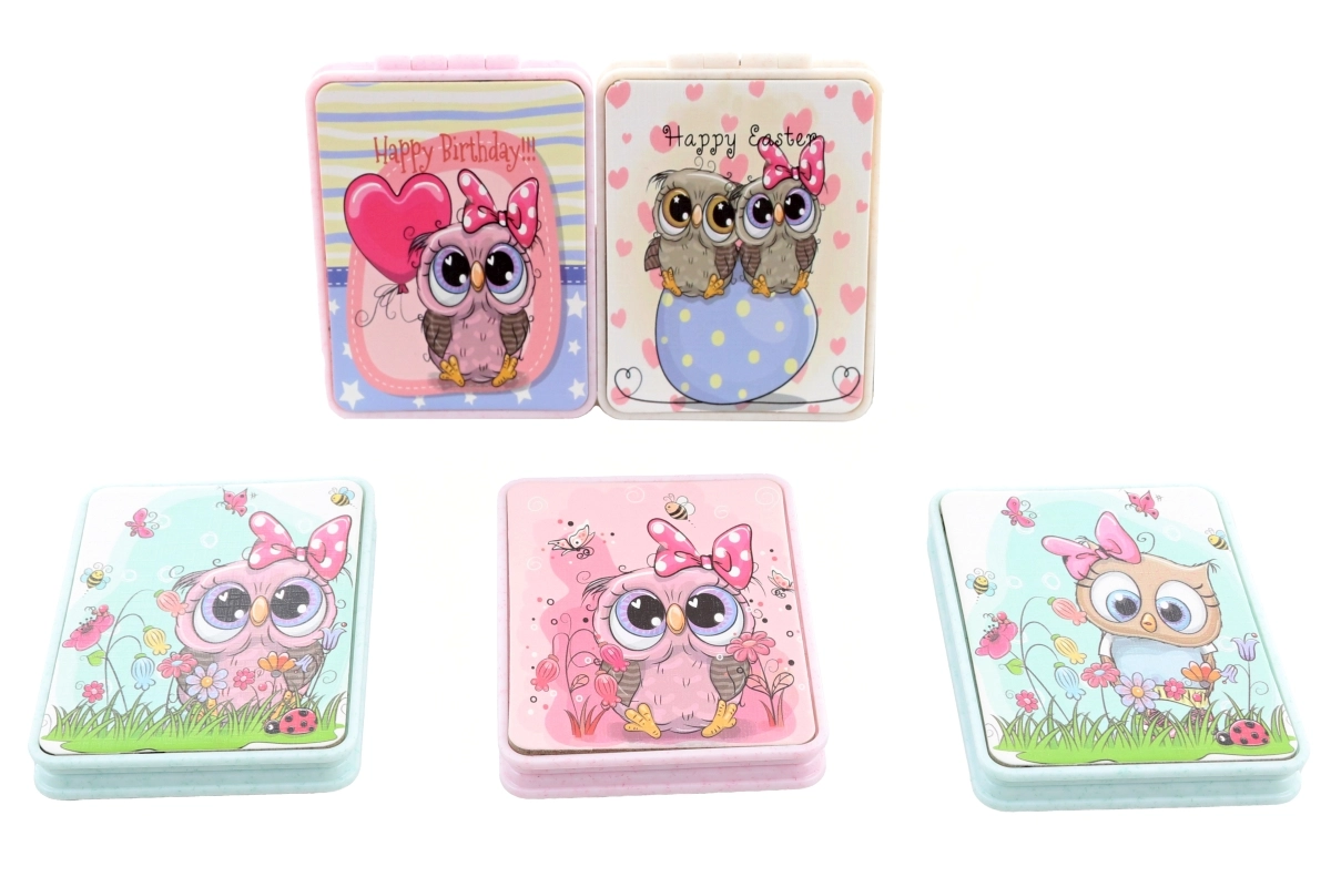 Genießen Sie den praktischen und stylischen Taschenspiegel mit Eulenmotiven, der in jede Handtasche passt. Dank der kompakten Maße und des leichten Kunststoffkörpers ist er ideal für Reisen, Schule und Arbeit. Die verschiedenen niedlichen Eulenmotive erfreuen Kinder wie Erwachsene.
