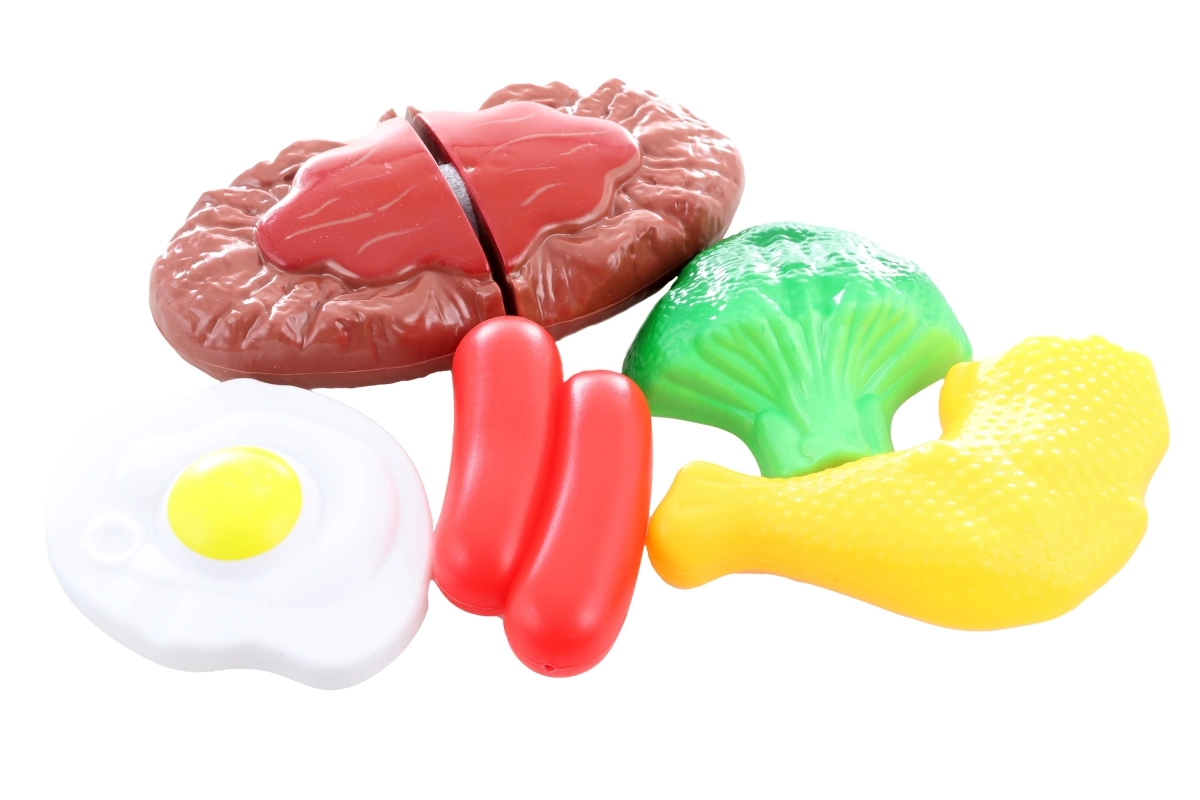 Eier, Steak, Würstchen, Hähnchenkeule, Fisch und Gemüse in leuchtenden Farben regen die Fantasie an und helfen Kindern, Lebensmittelarten zu erkennen.
