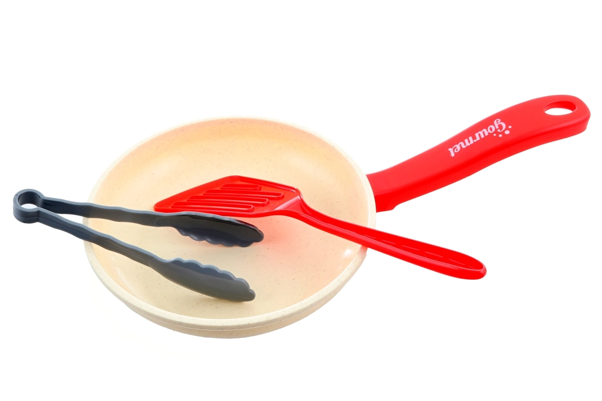 Die Pfanne mit rotem Griff, der geschlitzte Pfannenwender und die Zange aus strapazierfähigem Kunststoff sind so gestaltet, dass sie leicht zu halten und sicher zu benutzen sind.