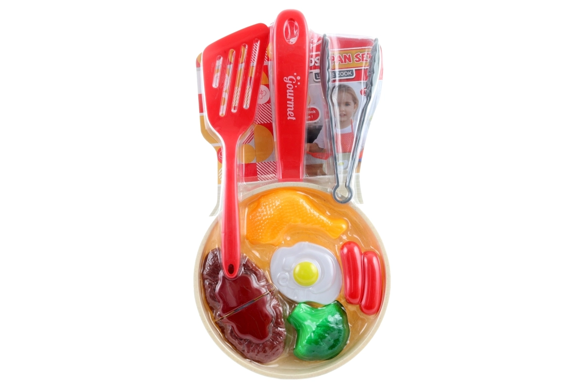 Im Set ist alles enthalten: Pfanne, Pfannenwender, Zange und 5 Lebensmittelteile (z. B. Ei, Steak, Wurst, Fisch oder Gemüse). Das Set besteht aus hochwertigem Kunststoff und ist für Kinder ab 3 Jahren geeignet.
