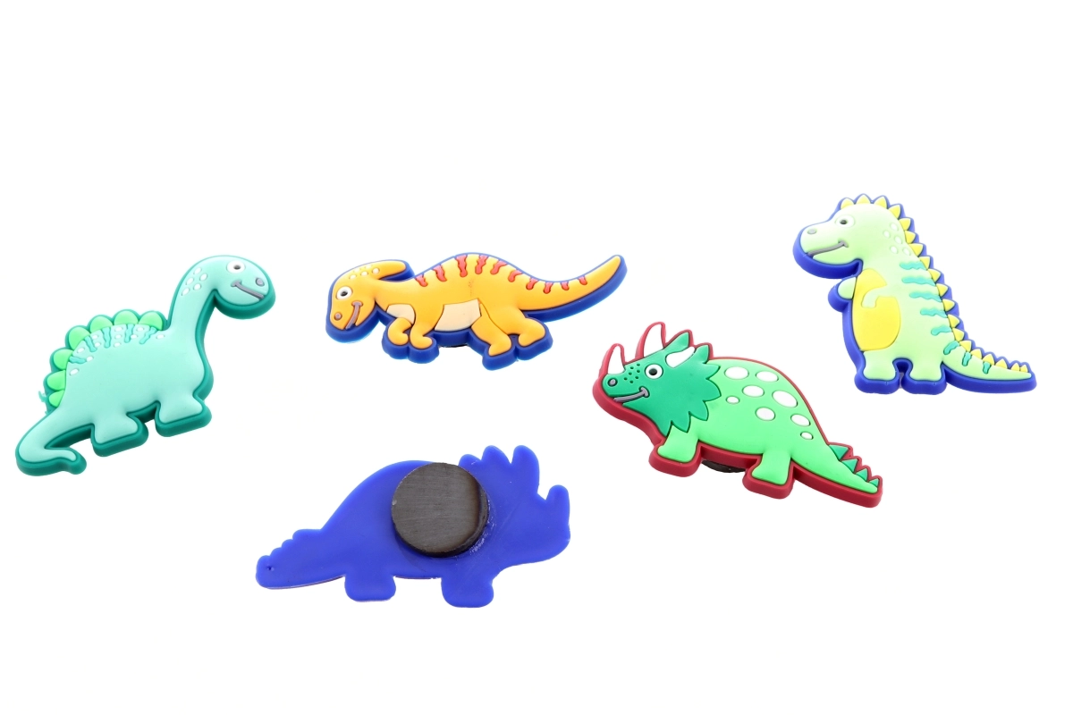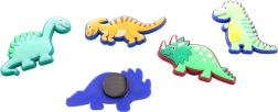 Fröhliche Magnete mit Dinosauriermotiven erfreuen Kinder und Erwachsene. Jeder Magnet ist etwa 5 × 5 cm groß, besteht aus weichem Kunststoff und ist für dekorative Zwecke bestimmt.