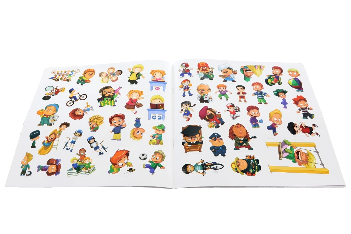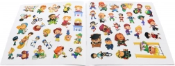 Zwei Bögen farbiger Sticker mit fröhlichen Motiven regen die Fantasie an und ermöglichen das Fertiggestalten der Bilder oder das Verzieren von Heften und Tagebüchern.