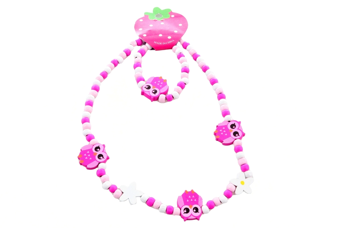 Ein niedliches Accessoire-Set für kleine Fashionistas mit Eulenmotiv erfreut jede Liebhaberin bunter Perlen. Enthält eine Halskette und ein Armband aus Holzperlen, aufgezogen auf elastischem Gummiband für bequemes Tragen und leichtes Anziehen.