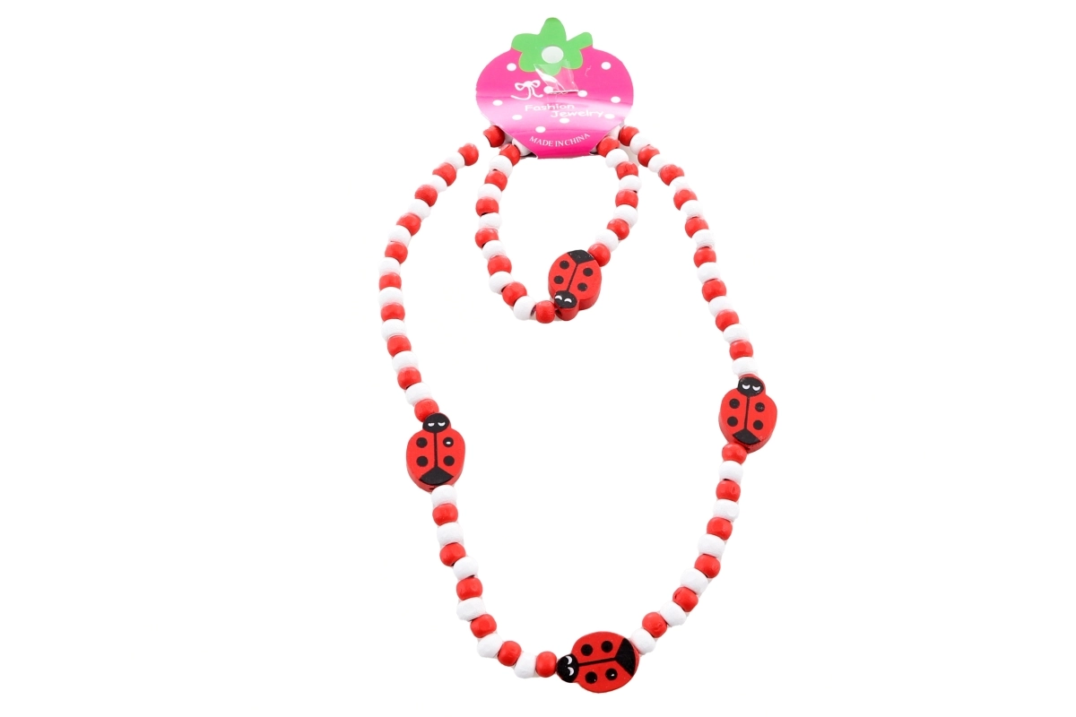 Dieses zarte Set mit Marienkäfermotiv verleiht jedem Outfit einen fröhlichen Akzent. Die Holzperlen sind angenehm im Griff und das elastische Band sorgt für leichtes Anlegen und hohen Tragekomfort. Perfekt für kleine Liebhaberinnen auffälliger, aber leichter Accessoires.