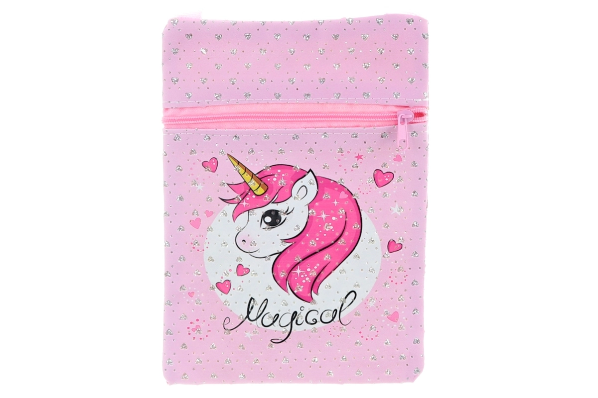 Diese elegante Schultertasche mit zauberhaftem Einhornmotiv ist perfekt für den täglichen Gebrauch. Dank der kompakten Maße passen Handy, Schlüssel und Geldbörse bequem hinein, während der Reißverschluss die sichere Aufbewahrung aller Kleinigkeiten gewährleistet.