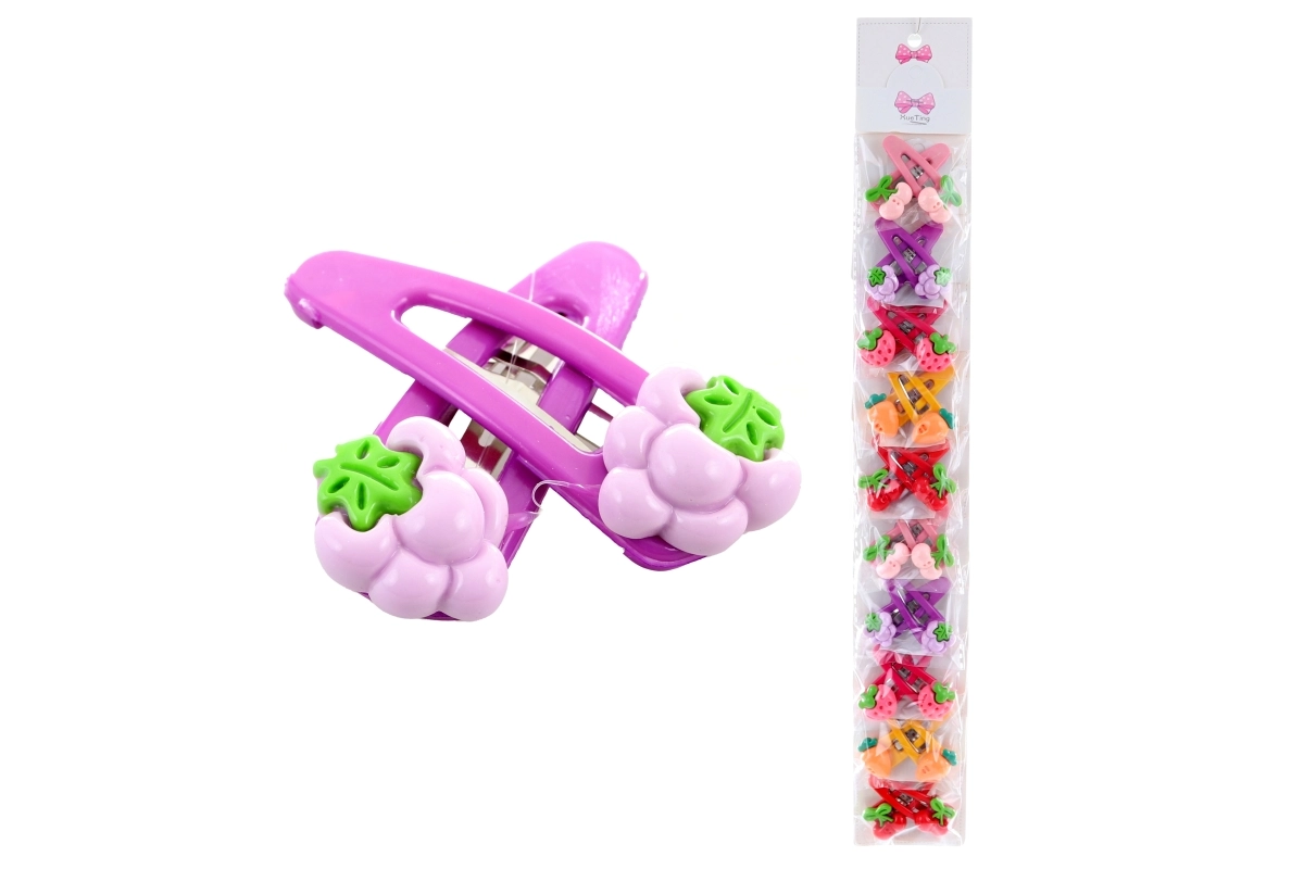 Süße Haarspangen mit Obstmotiv verleihen Ihrer Frisur Pfiff und Farbe. In jeder Packung finden Sie 2 hochwertige Spangen in verschiedenen Farben, ideal für den täglichen Gebrauch. Lieferung nur im 10er-Pack (10× Set à 2 Stk.) im praktischen Beutel.