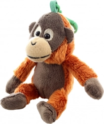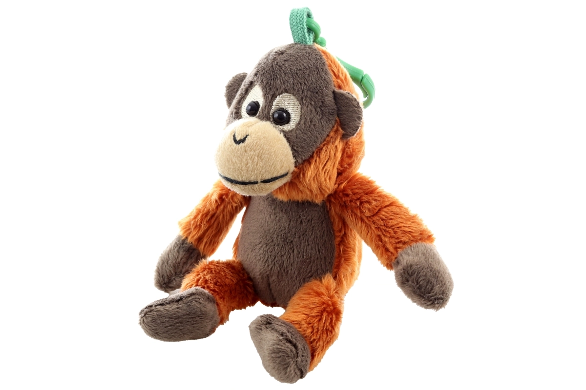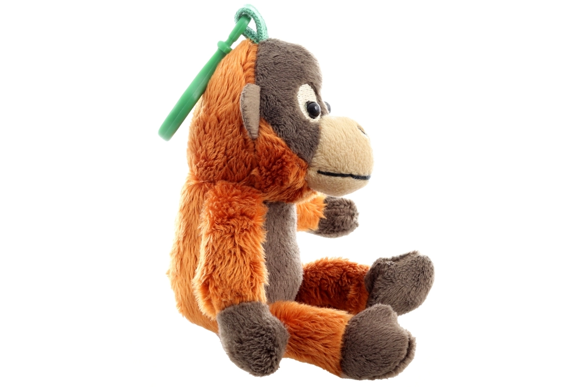 Der grüne Clip ermöglicht es, den Orang-Utan schnell am Rucksack, Kinderwagen oder Schlüsselbund zu befestigen – immer griffbereit und spielbereit.