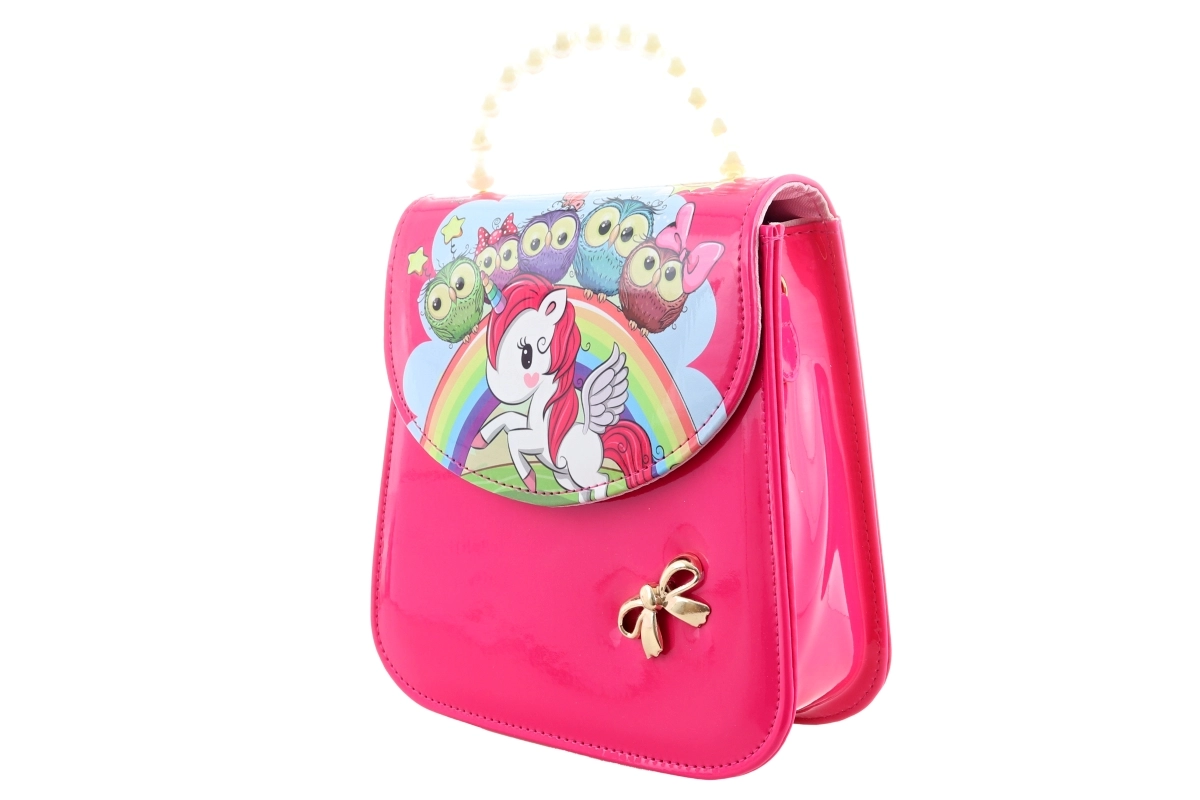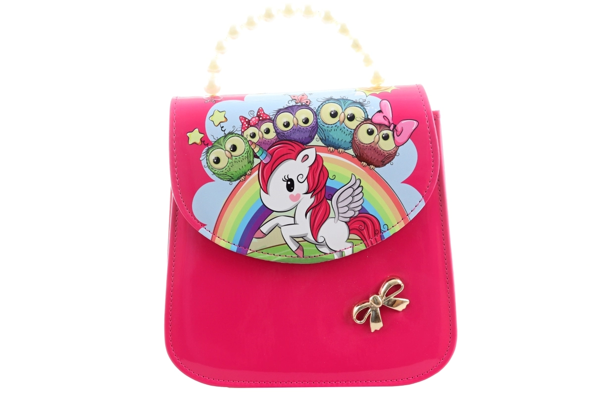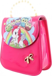 Diese stilvolle rosa Handtasche mit farbigem Print von Einhorn, Regenbogen, Sternchen und Eulen ist für Kinder gemacht, die verspieltes Design lieben und ihre kleinen Schätze gern griffbereit haben. Die glänzende Oberfläche ist pflegeleicht und wirkt elegant.