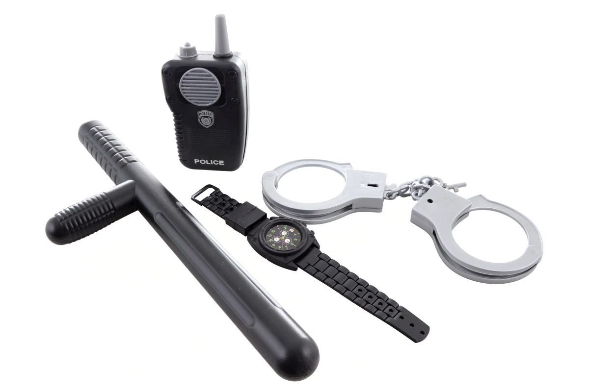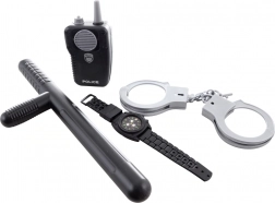 • Komplettes Set: Weste, Uhr, Funkgerät, Handschellen und Schlagstock