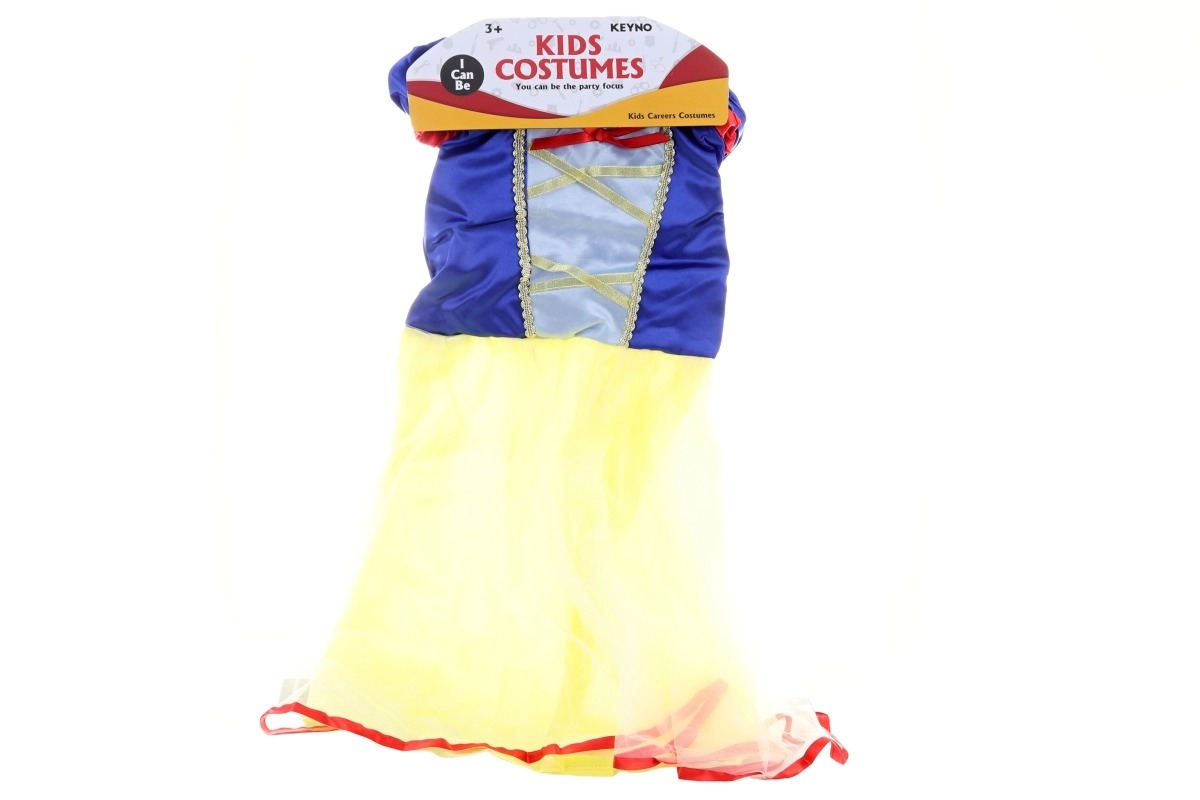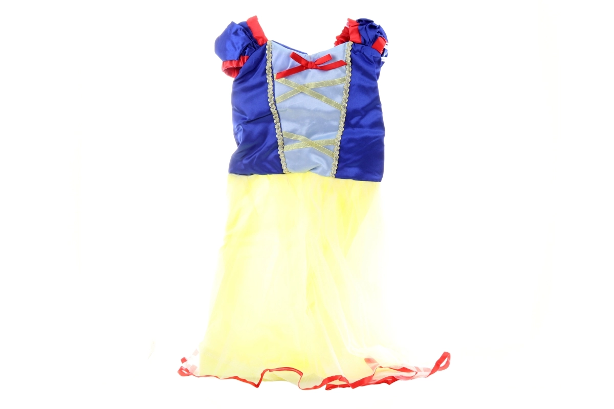 Verwandeln Sie Ihr Mädchen in eine Märchenprinzessin! Dieses Kleid im Schneewittchen-Stil überzeugt mit einem blauen Mieder mit Zierschnürung und einem langen gelben Rock mit rotem Saum. Perfekt für Karneval, Kinderfeste und Rollenspiele zu Hause.