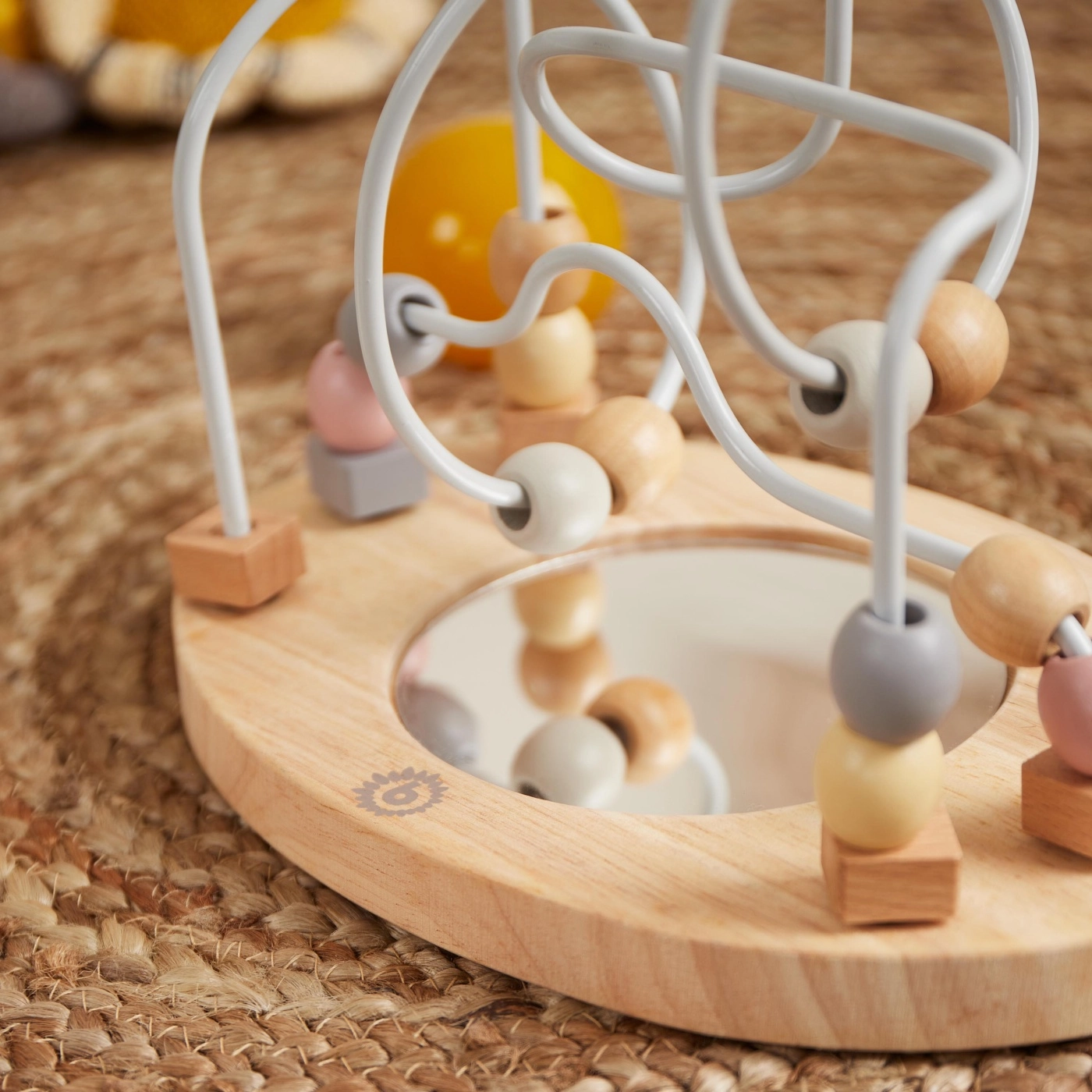 Dieses stilvolle Motorik-Labyrinth in Rosatönen ist das ideale Spielzeug für erste Fertigkeiten. Durch das Verschieben der Perlen auf den Drahtbahnen trainieren Kinder Greifen, Geduld und räumliches Vorstellungsvermögen. Der Spiegel in der Mitte zieht die Aufmerksamkeit auf sich und unterstützt Selbstwahrnehmung sowie die sensorische Entwicklung.