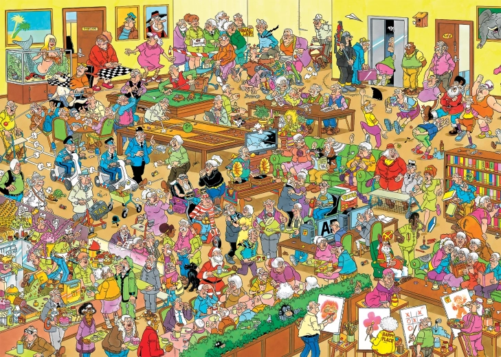 Entdecken Sie einen Gag nach dem anderen in der originellen Illustration „Seniorenheim“ des Künstlers Jan van Haasteren, exklusiv geschaffen für die Marke JUMBO. Der typische, humorvolle Stil mit vielen Figuren und unerwarteten Situationen zieht Sie in seinen Bann.