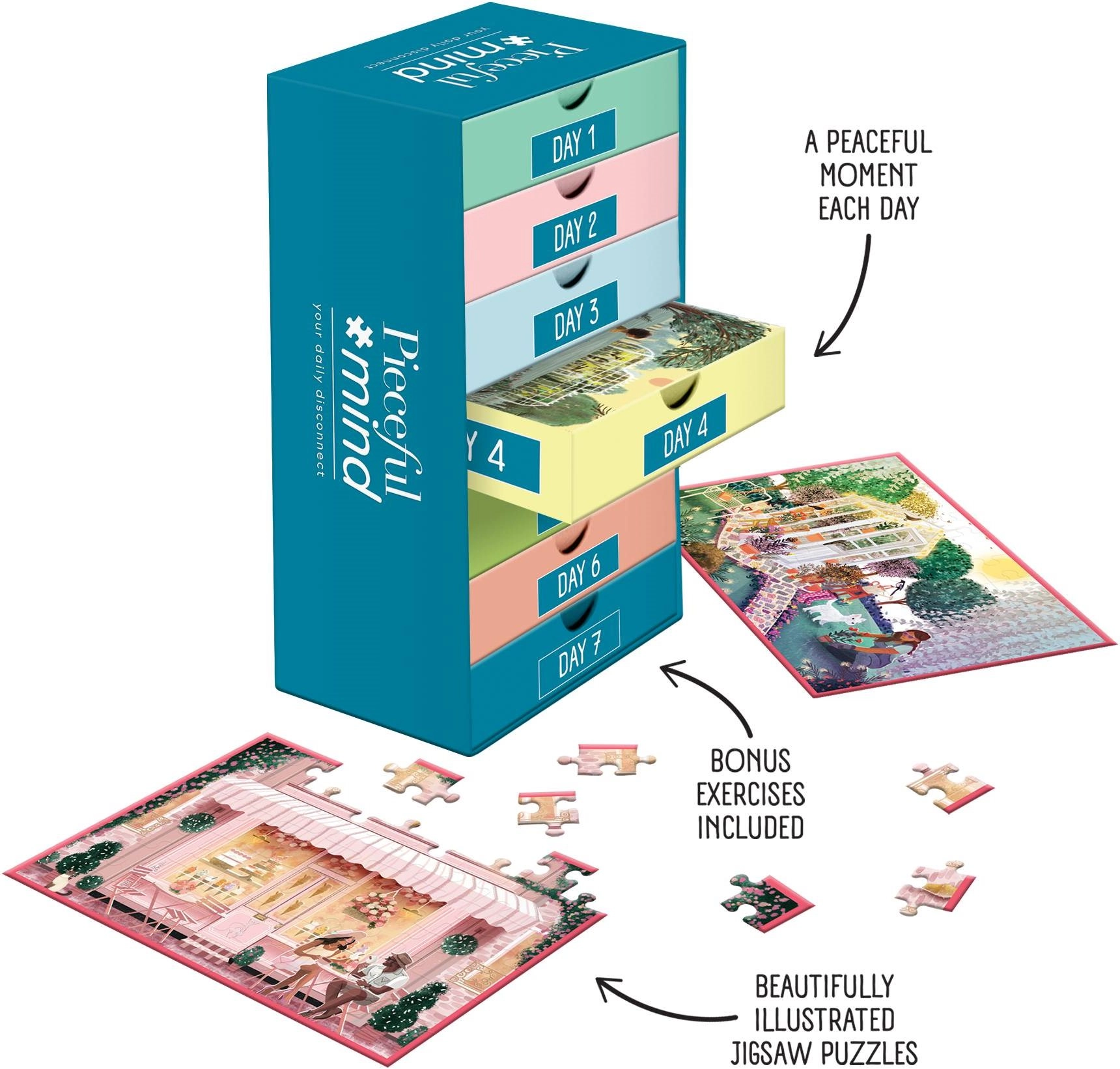 Das Set JUMBO Pieceful Mind enthält 6 einzelne Puzzles mit je 54 Teilen, die darauf ausgelegt sind, den Geist zu beruhigen und zu regelmäßigen Pausen zu inspirieren. Jedes Minipuzzle hat kompakte Abmessungen und eignet sich perfekt für kurze tägliche Ruhephasen.