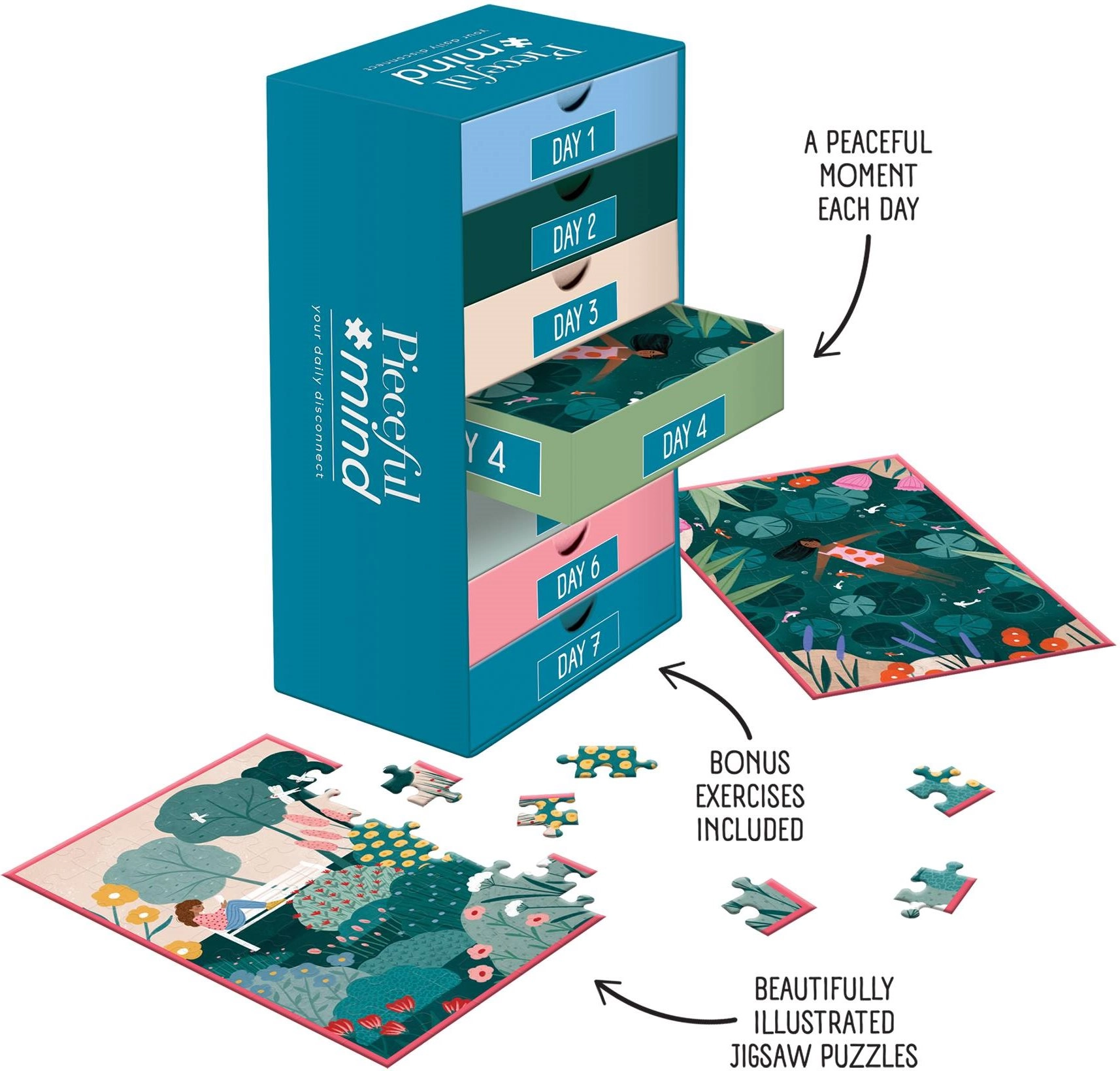 Schaffen Sie sich Ihre tägliche Routine der Gelassenheit: Legen Sie jeden Tag eines der sechs Naturmotive und genießen Sie am Ende der Woche eine überraschende Enthüllung. Die Puzzles sind so gestaltet, dass sie Entspannung, Achtsamkeit und gute Laune unterstützen.