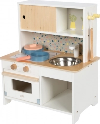 Diese stilvolle weiße Küche mit natürlichen Holzakzenten und einer verspielten Rückwand im Terrazzo-Muster fördert kreatives Rollenspiel, die Entwicklung der Feinmotorik und sozialer Kompetenzen. Die kompakten Maße sparen Platz und eignen sich daher ideal für kleinere Zimmer oder als Zweitküche bei den Großeltern.