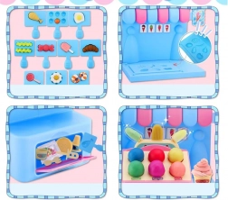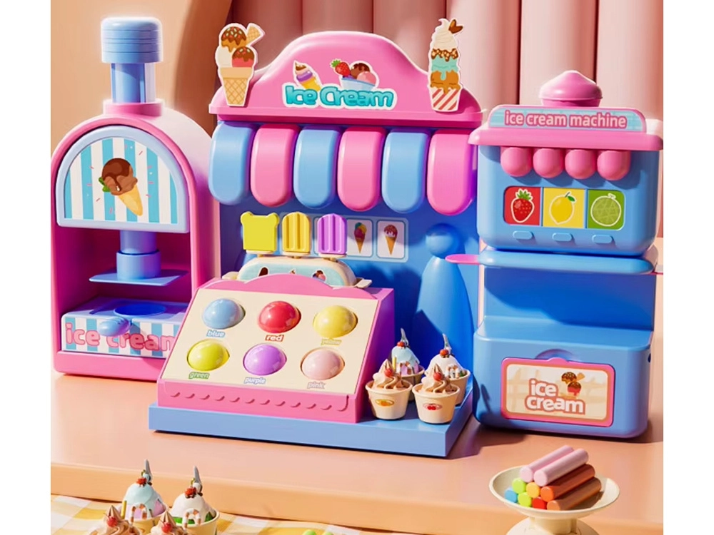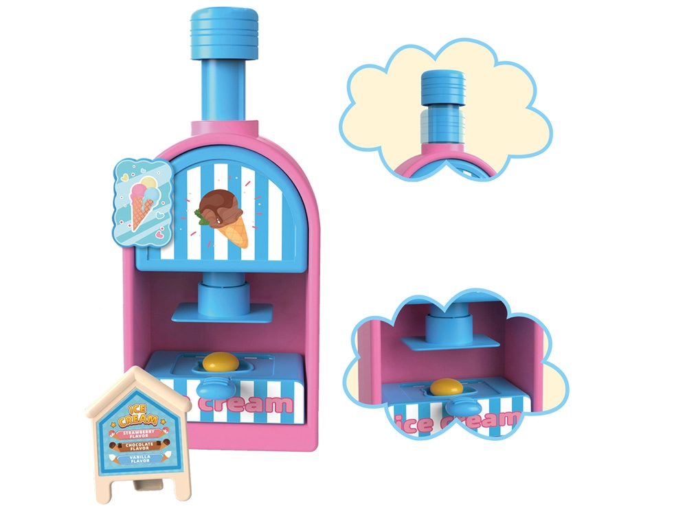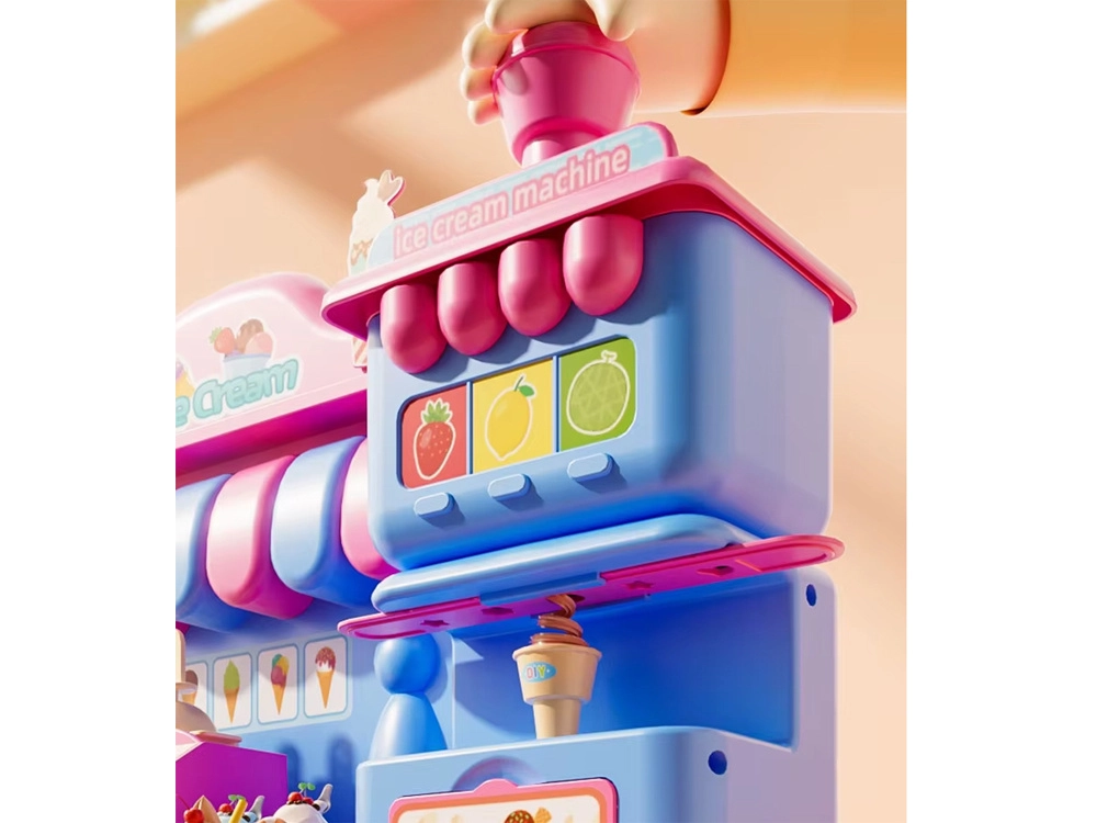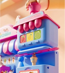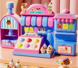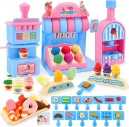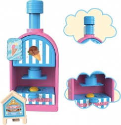 Das umfangreiche Spielset umfasst eine Eismaschine zum Herausdrücken bunter Portionen, einen Verkaufstresen zur Präsentation der Leckereien und eine Presse mit „Back“-Form zum Gestalten von Törtchen und Keksen. Alles ist in zarten Rosa- und Blautönen gehalten, damit die Kreationen wie aus einer echten Konditoreivitrine wirken.