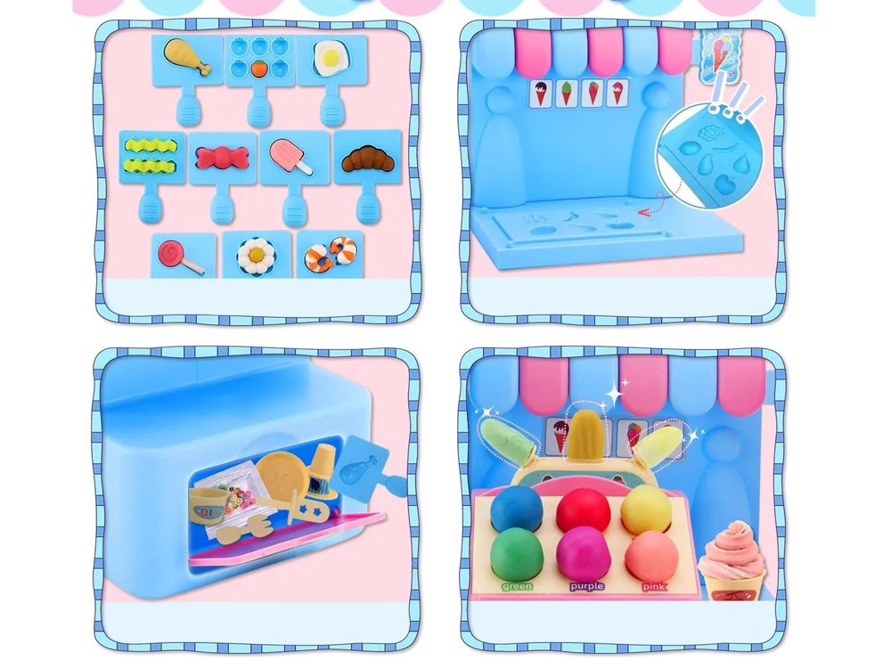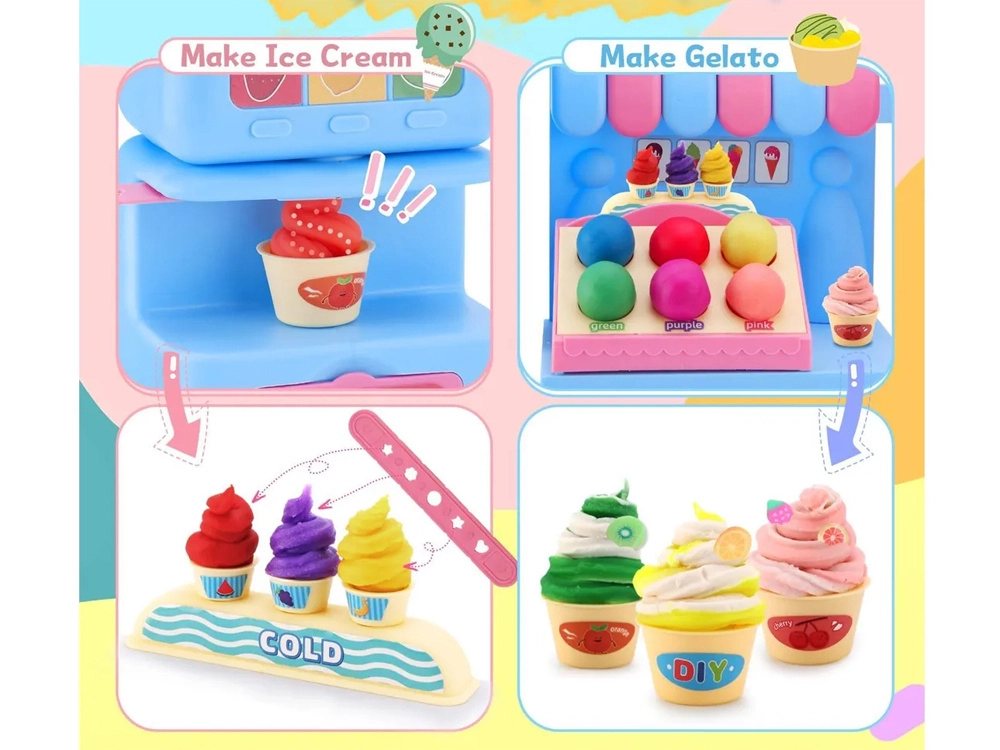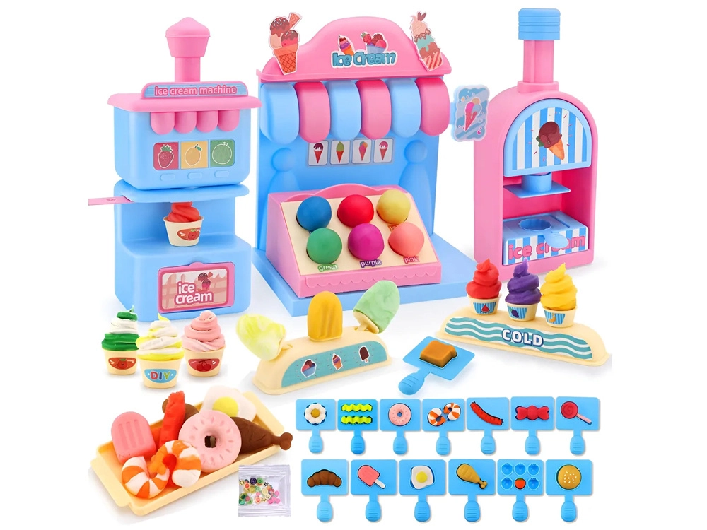 Inklusive reichhaltiger Ausstattung – von 12 Bechern Knete in verschiedenen Farben über Förmchen und Werkzeuge bis hin zu Bechern, Eiswaffeln und Stielen für Eis am Stiel. Kinder können so einen „Kuchen“ backen, Obst formen, ein Baguette zubereiten oder Spiraleis herausdrücken.